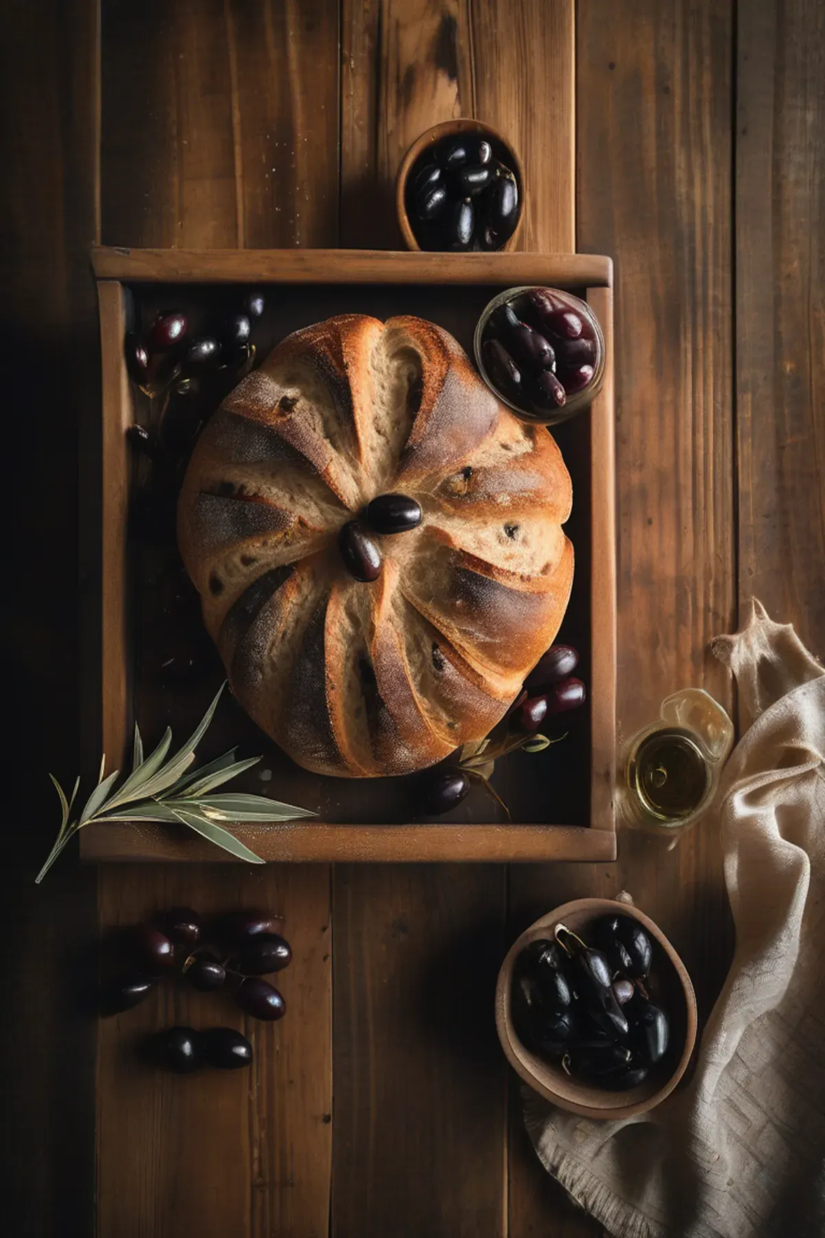A rustic artisan sourdough bread studded with briny Kalamata olives and fragrant rosemary, perfect for slicing warm from the oven with a generous drizzle of olive oil.