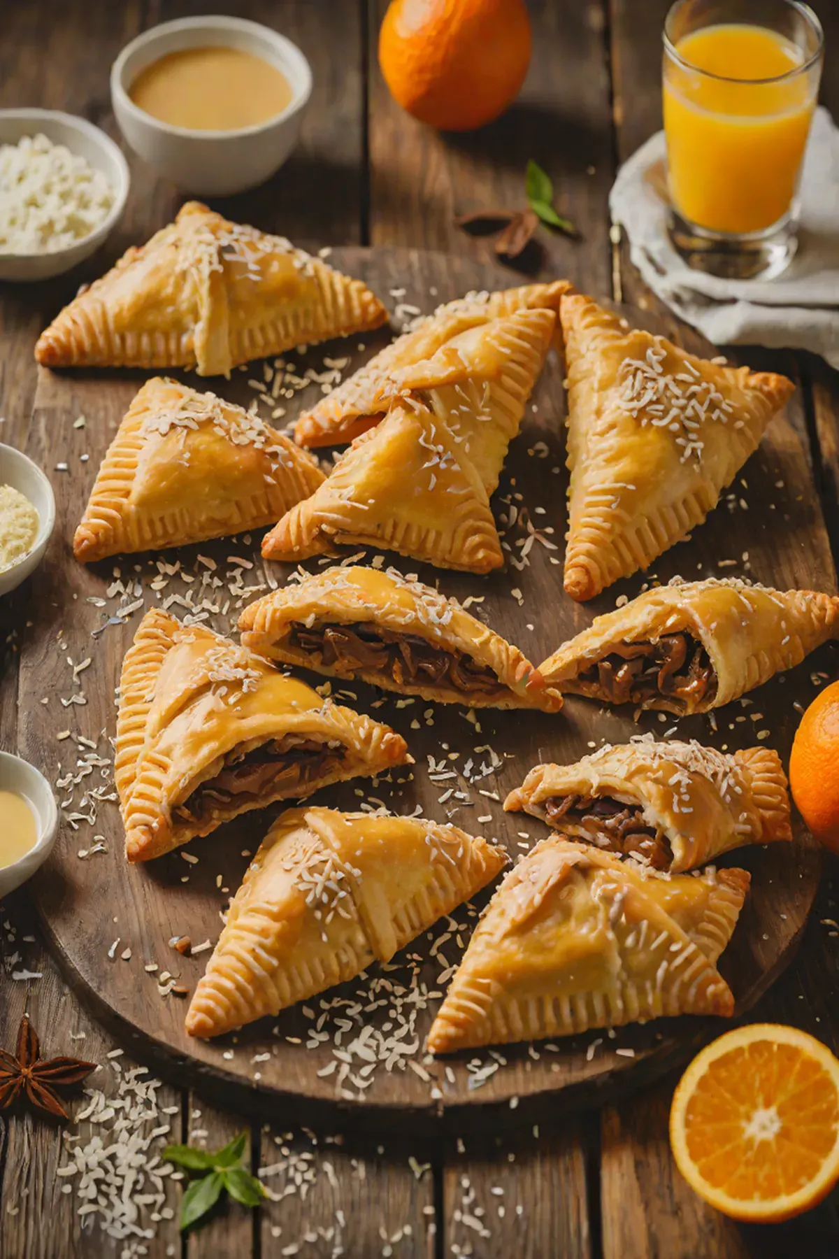 Place a spoonful of the orange-chocolate filling in the center of each piece of dough. Fold the dough over to form a triangle and press the edges to seal.