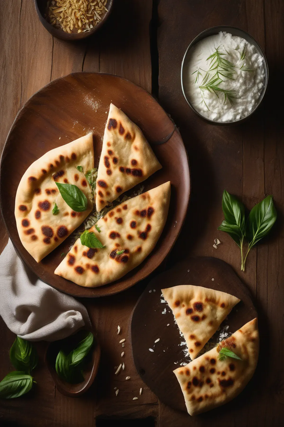 Soft, pillowy naan bread brushed with garlic butter and topped with crispy Parmesan cheese and fresh herbs. Perfect as a side dish or appetizer with any meal.