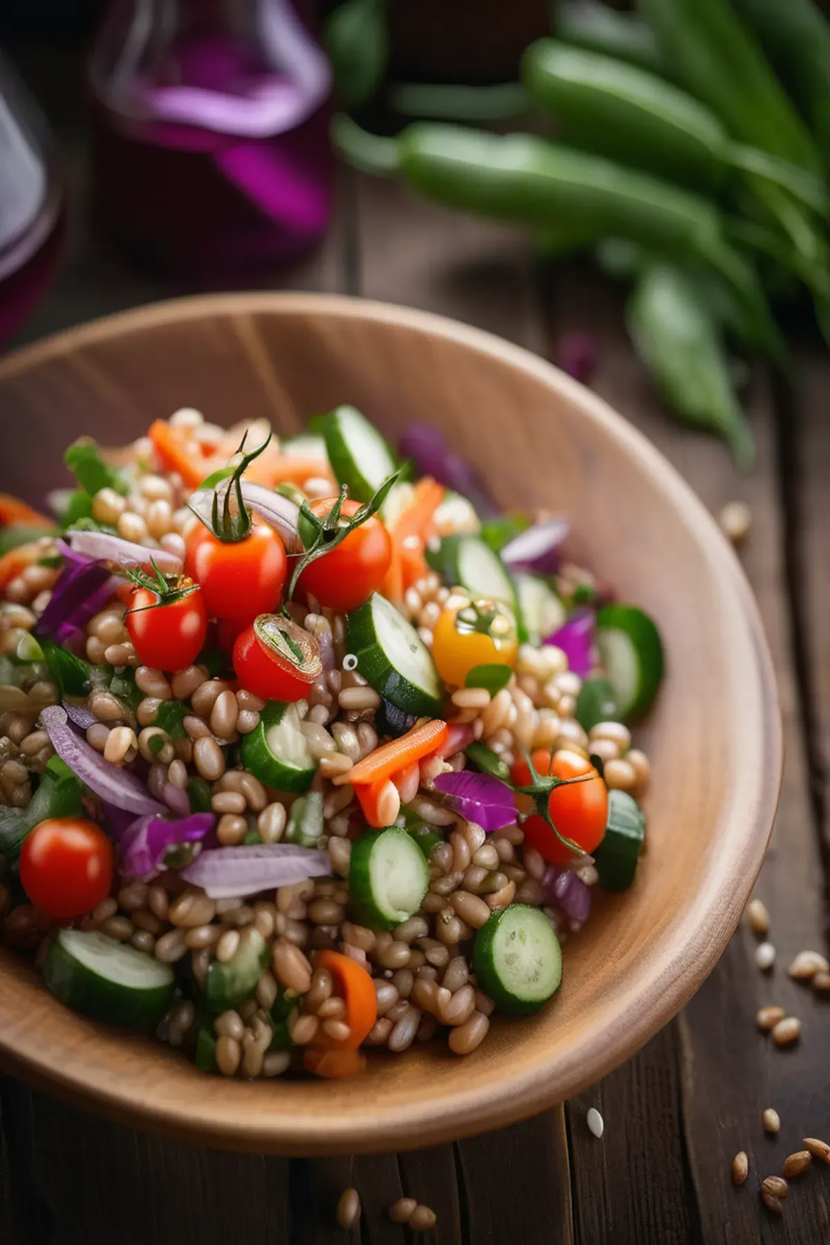 A refreshing and healthy salad perfect for a light lunch or dinner, featuring pearl barley and a variety of colorful vegetables.