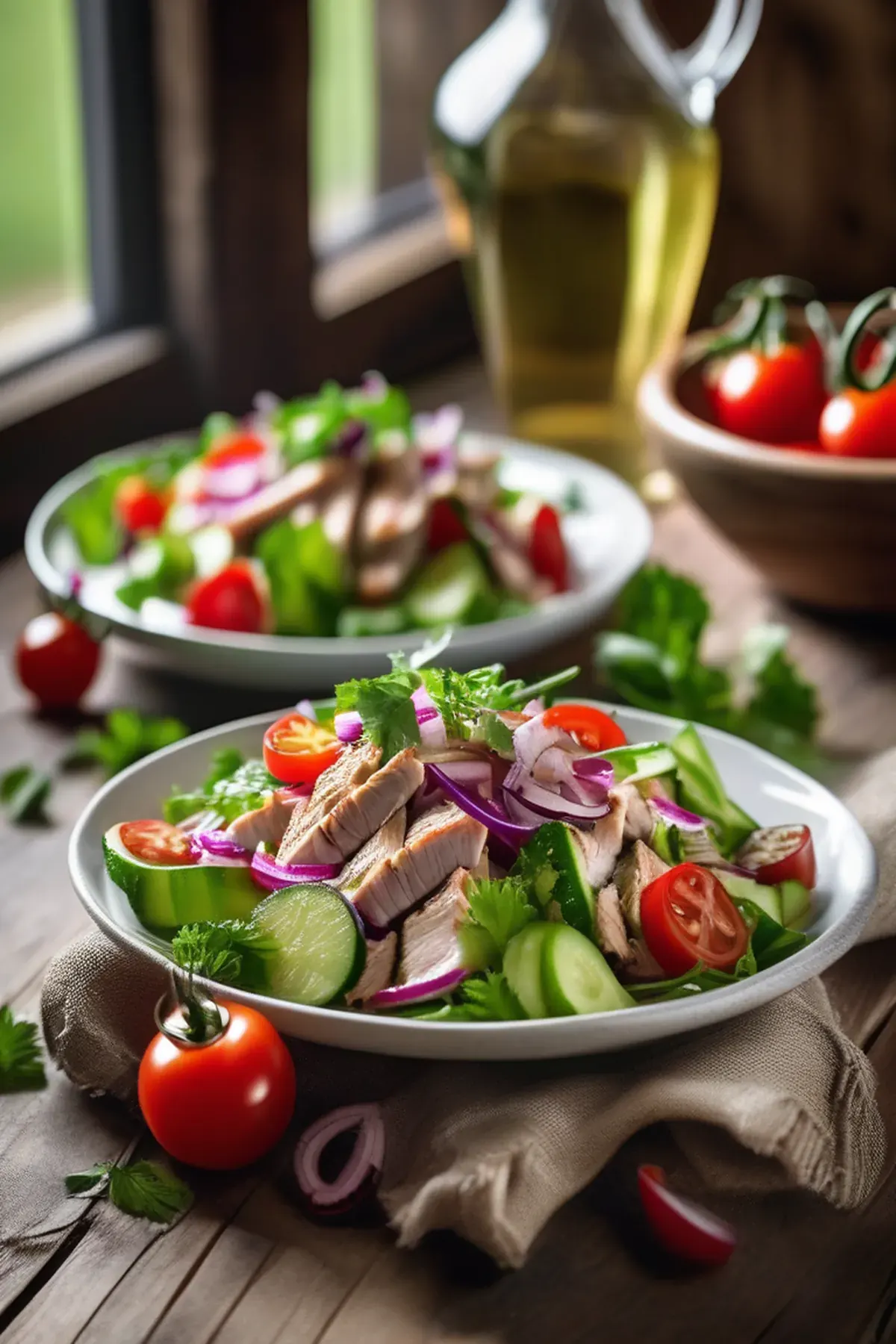 In a large mixing bowl, combine the cooked chicken, red onion, cherry tomatoes, cucumber, and cilantro. Pour the dressing over everything and toss gently to coat evenly.