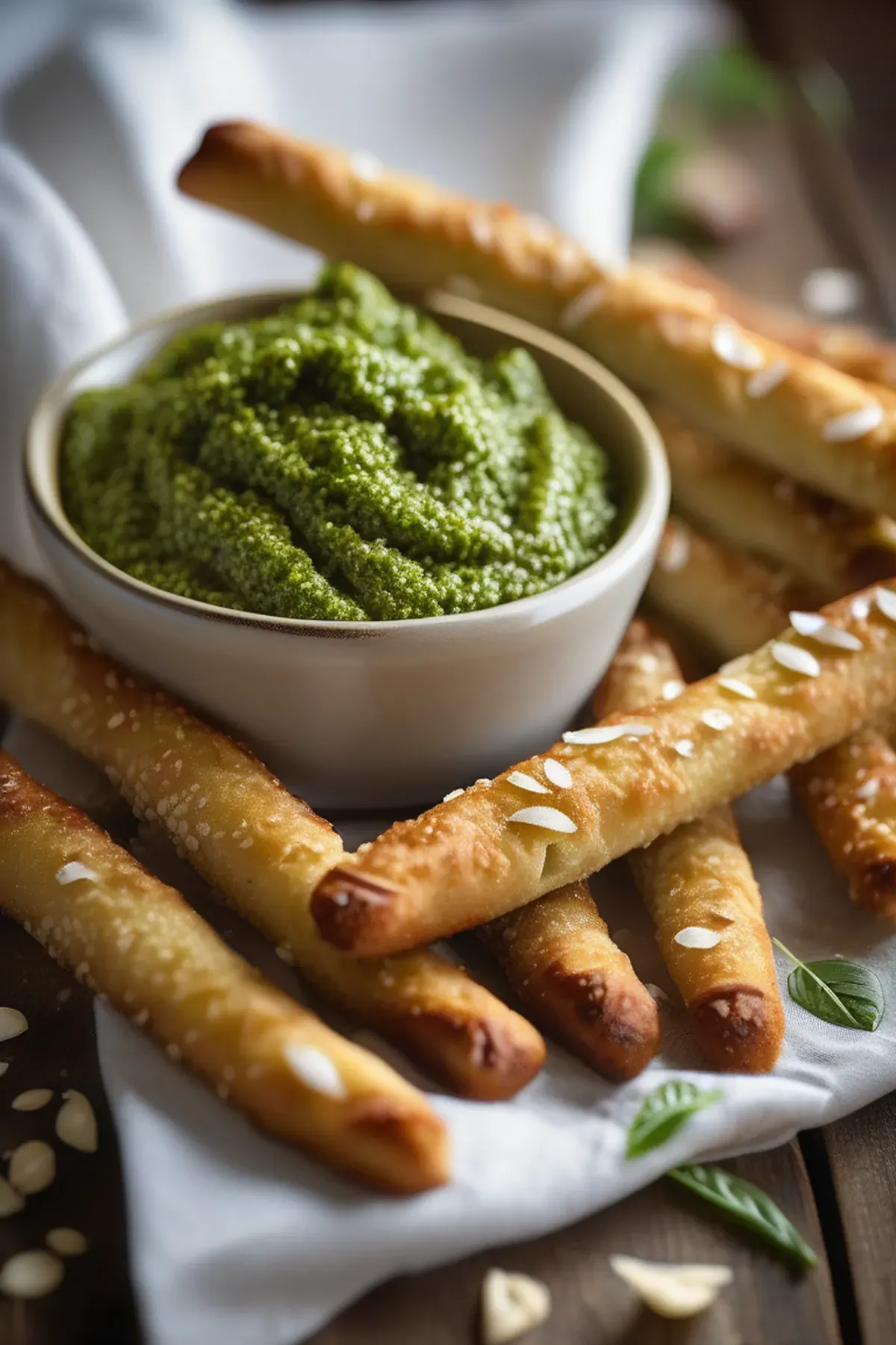 Crispy, golden breadsticks brushed with vibrant basil pesto and topped with parmesan cheese. Perfect as an appetizer or snack with a fresh, herbaceous flavor.