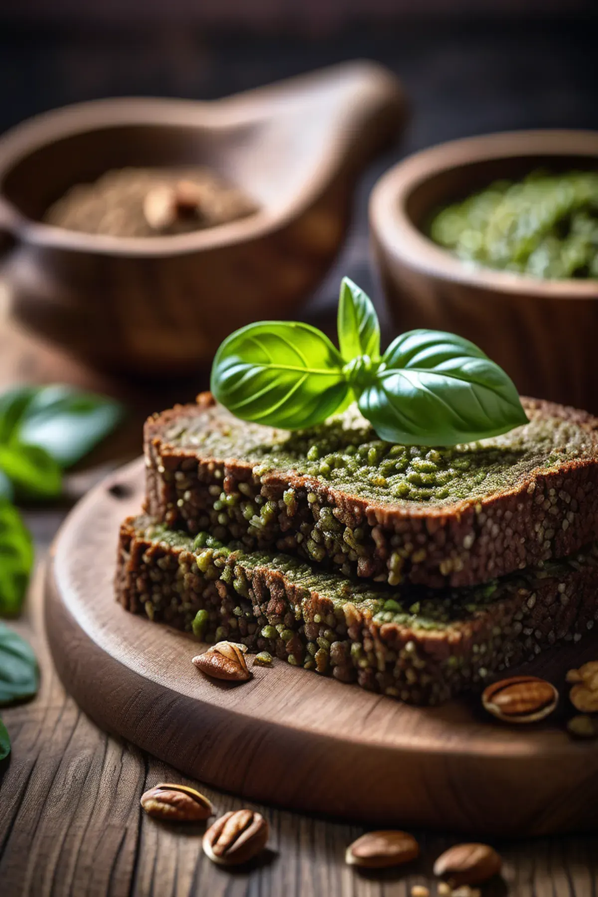 Toasted pumpernickel bread slices topped with a vibrant basil-walnut pesto, creamy ricotta, and roasted cherry tomatoes for a sophisticated appetizer or light lunch.