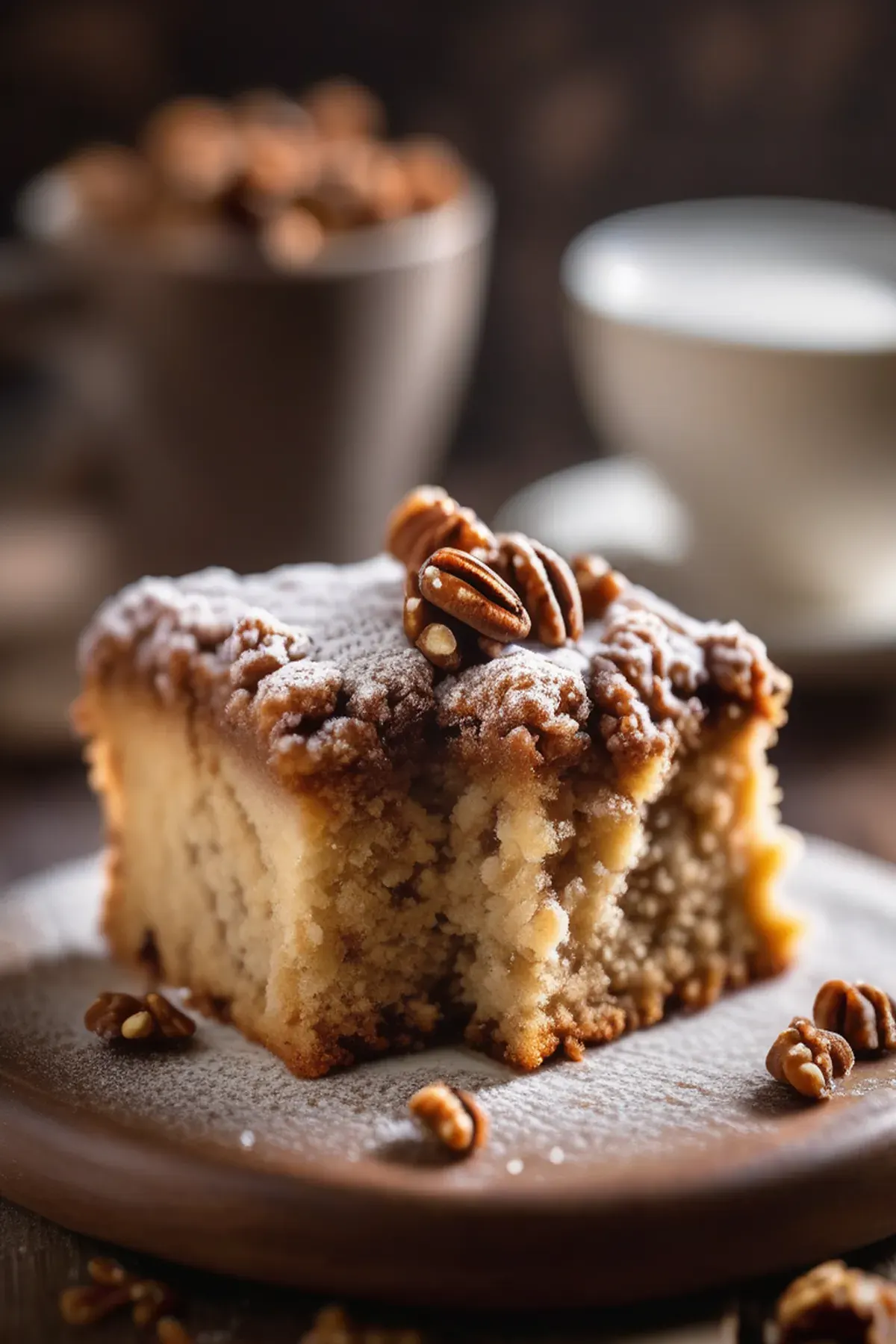 Moist and crumbly cake filled with sweet praline and topped with a crunchy streusel topping.