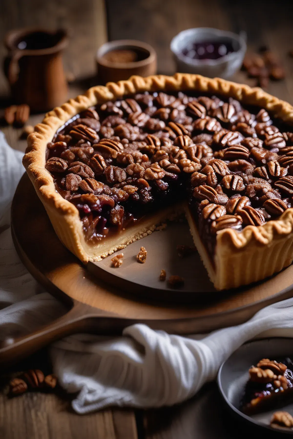 A rich and indulgent pie filled with caramelized praline, creamy custard, and crunchy pastry.