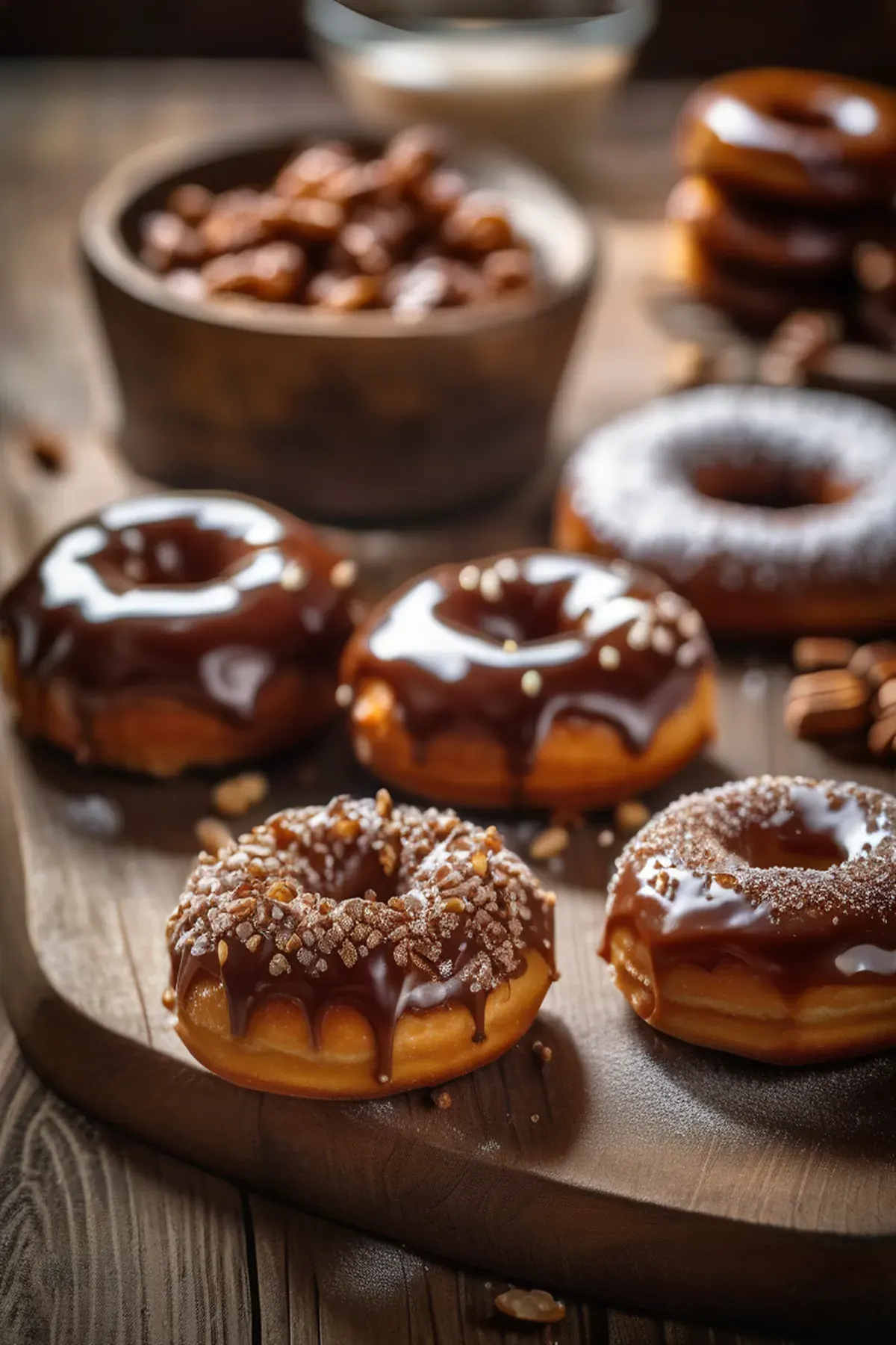 Soft, fluffy doughnuts smothered in a rich praline glaze, perfect for a sweet treat.