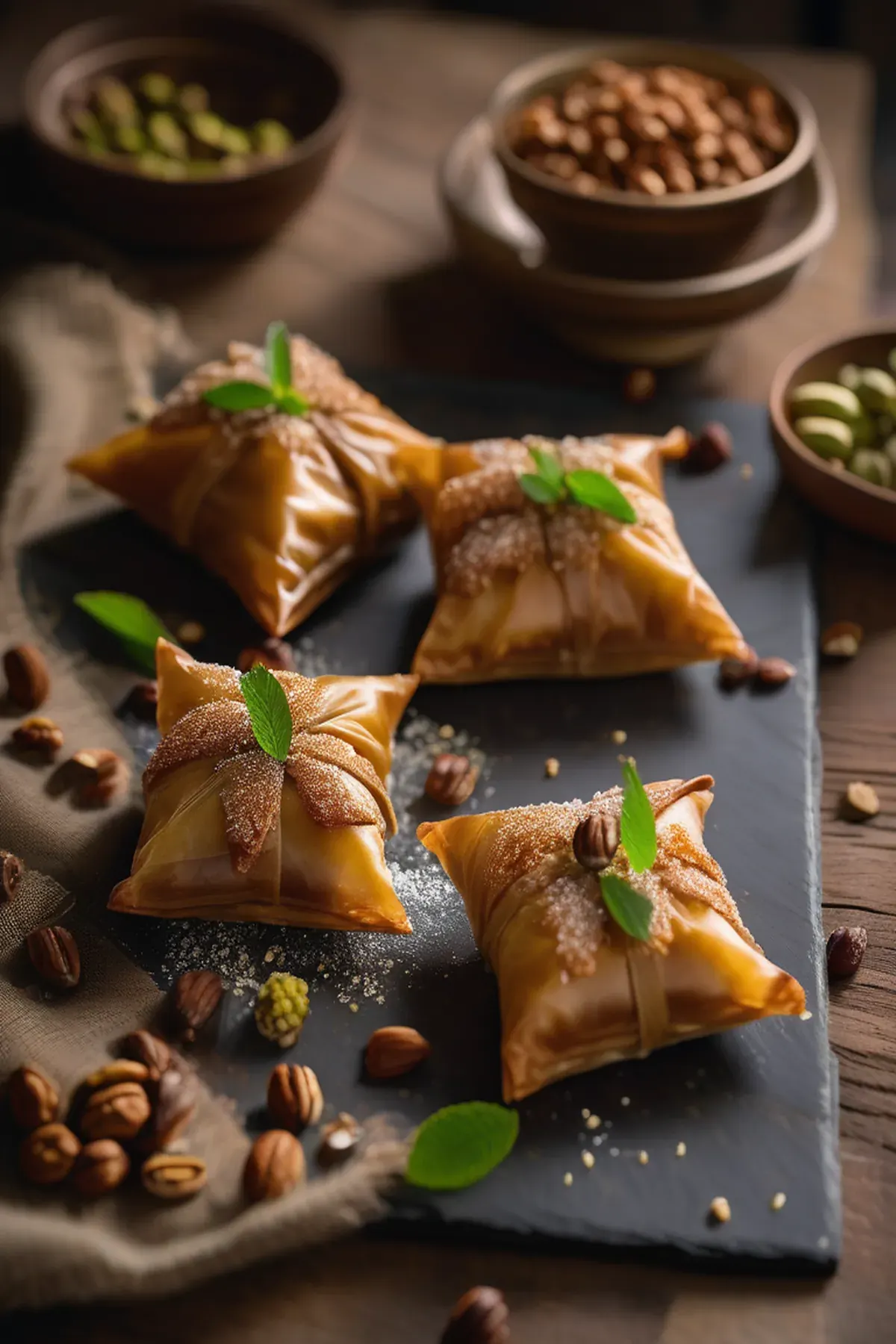 Crispy filo pastry parcels filled with a rich praline and nutty hazelnut centre.