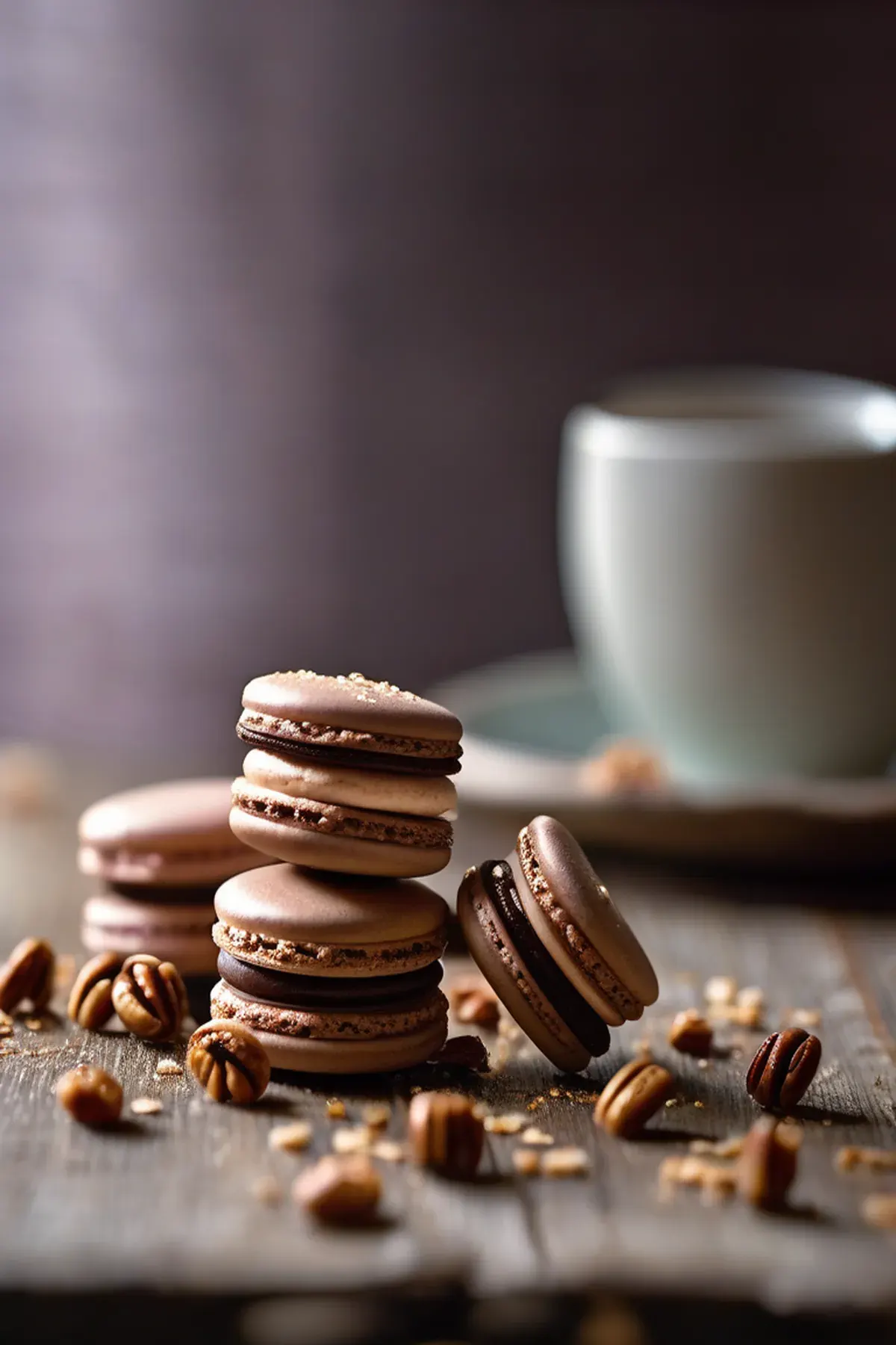 Crispy, chewy macarons with a rich praline filling, perfect for a sweet treat.