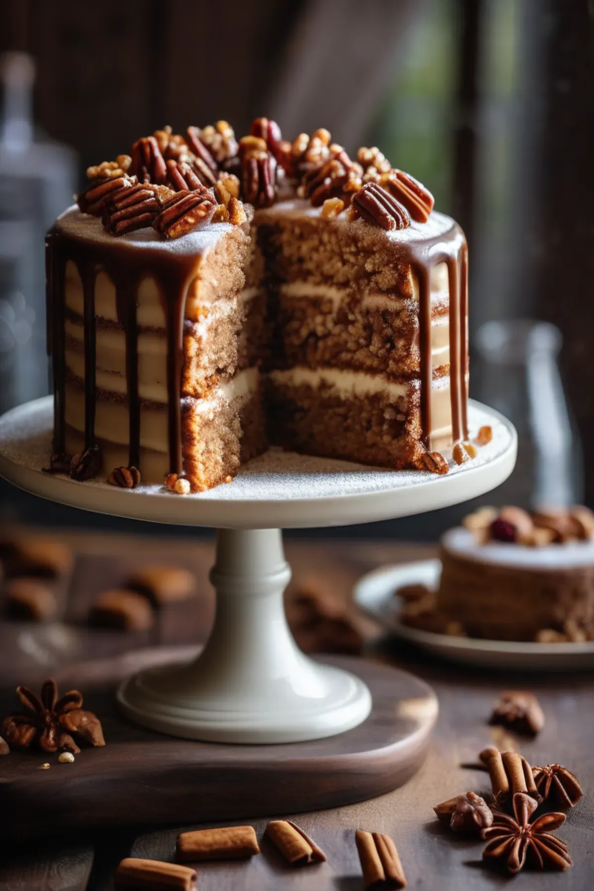 A rich, indulgent cake infused with the warm, caramel flavors of praline, perfect for satisfying any sweet tooth.