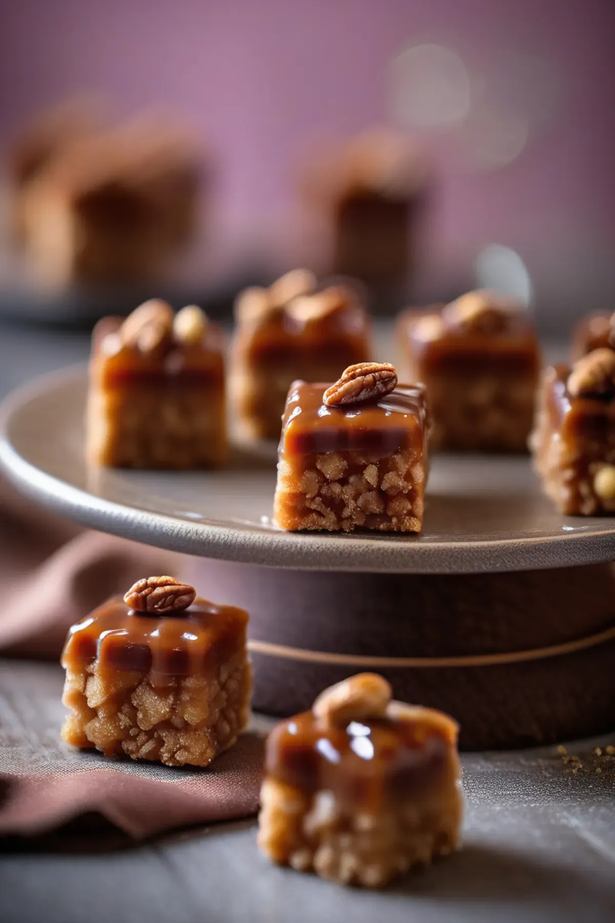 Rich, buttery praline cakelets in individual cups, topped with a layer of caramel and crunchy praline pieces.