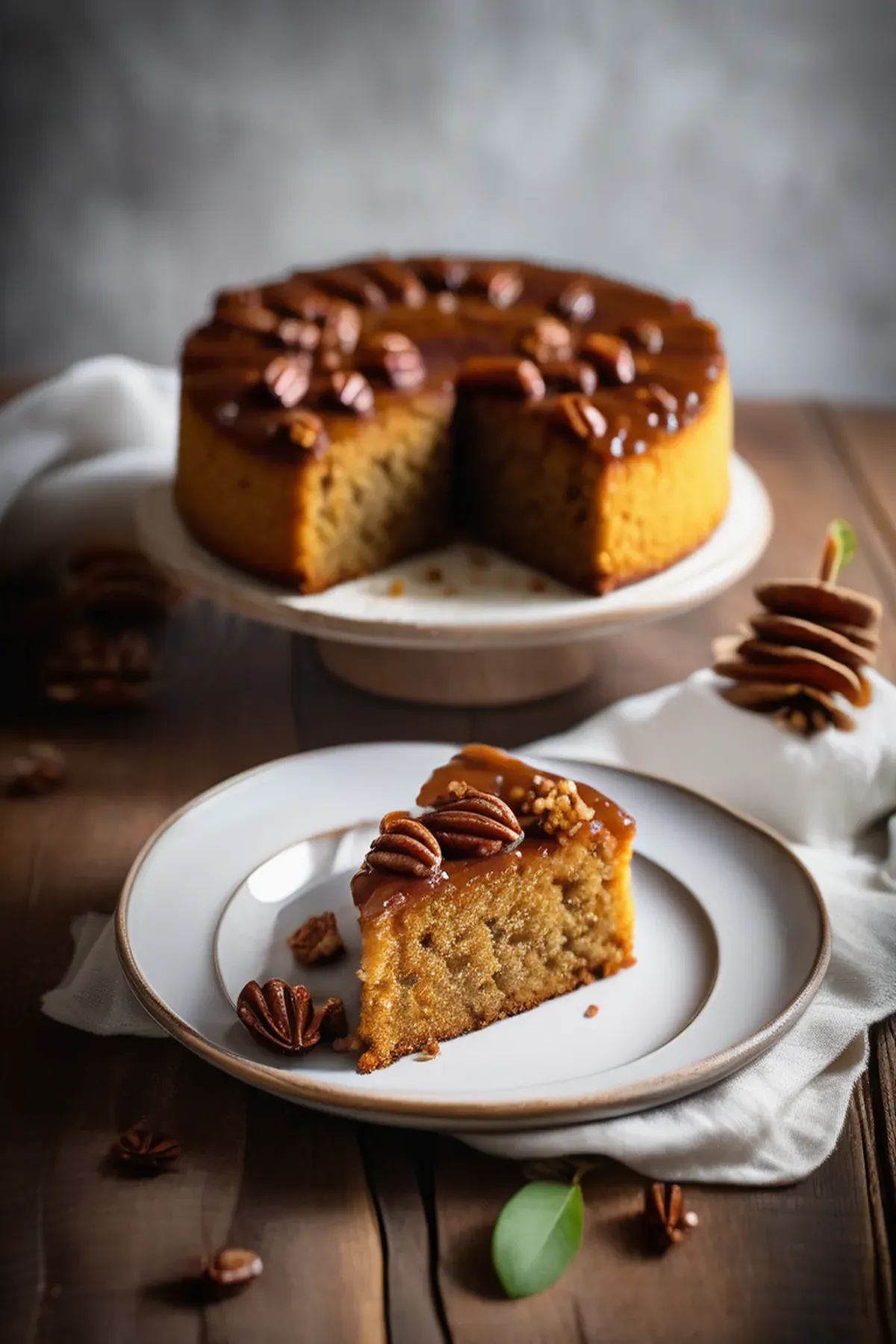 Moist polenta cake infused with caramelized praline and topped with a crunchy pecan streusel.