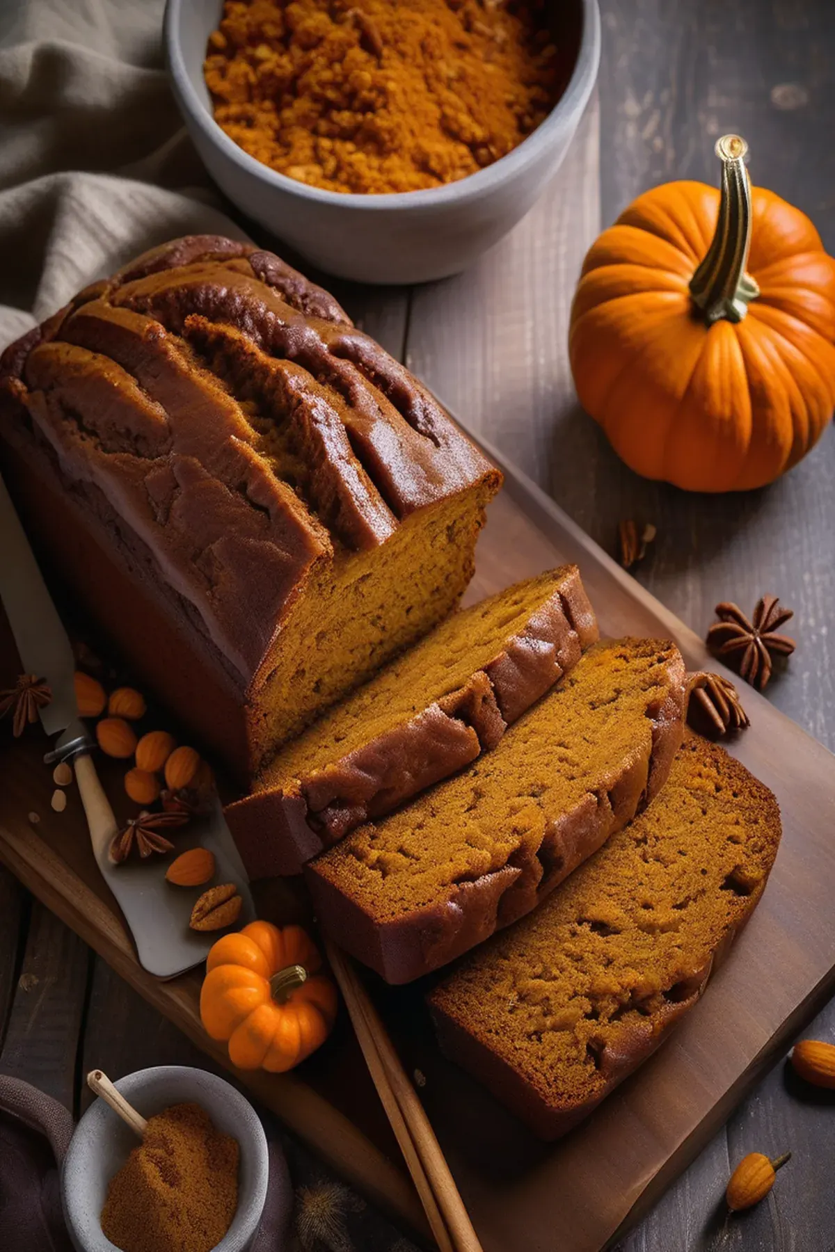 Moist and flavorful pumpkin bread infused with the sweetness of praline, perfect for a cozy fall morning.