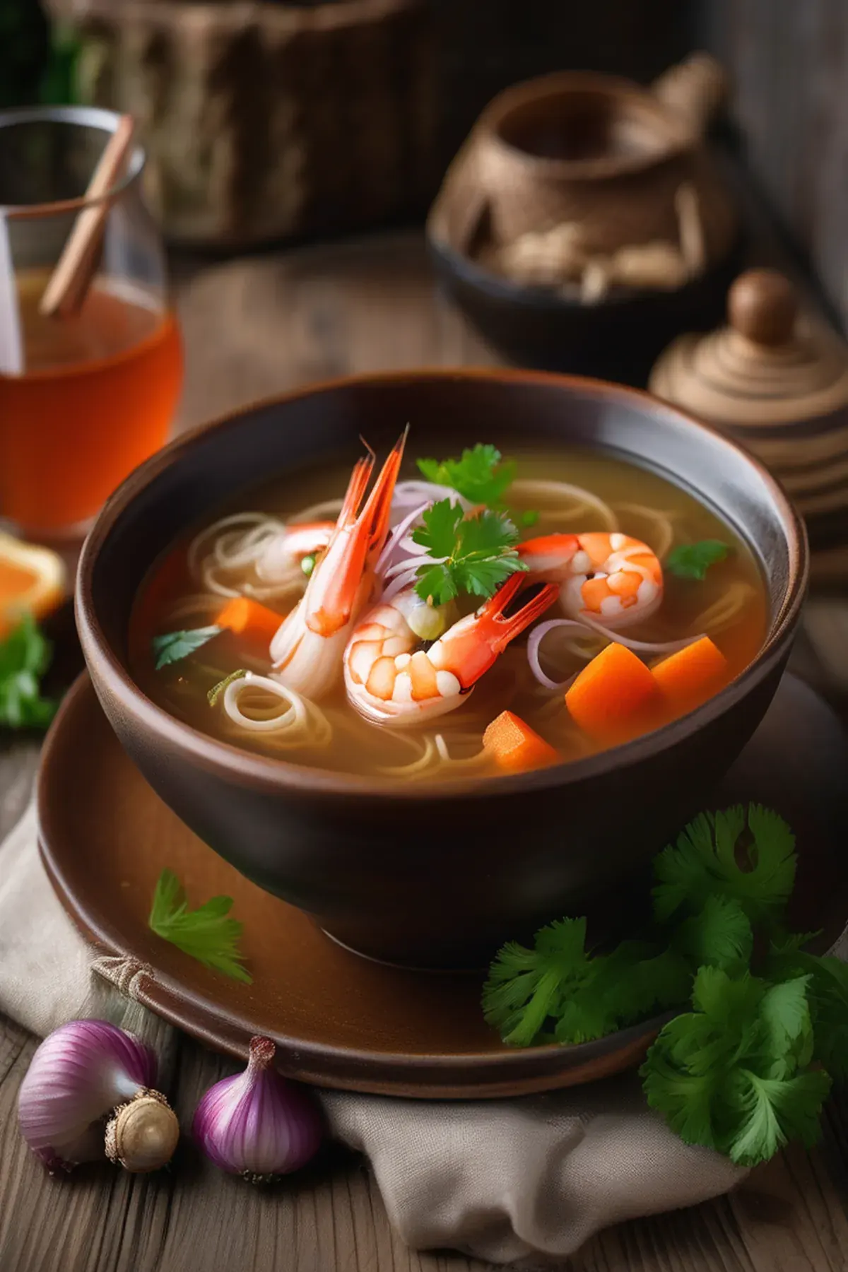 A light and flavorful soup made with prawns, vegetables, and aromatic spices.