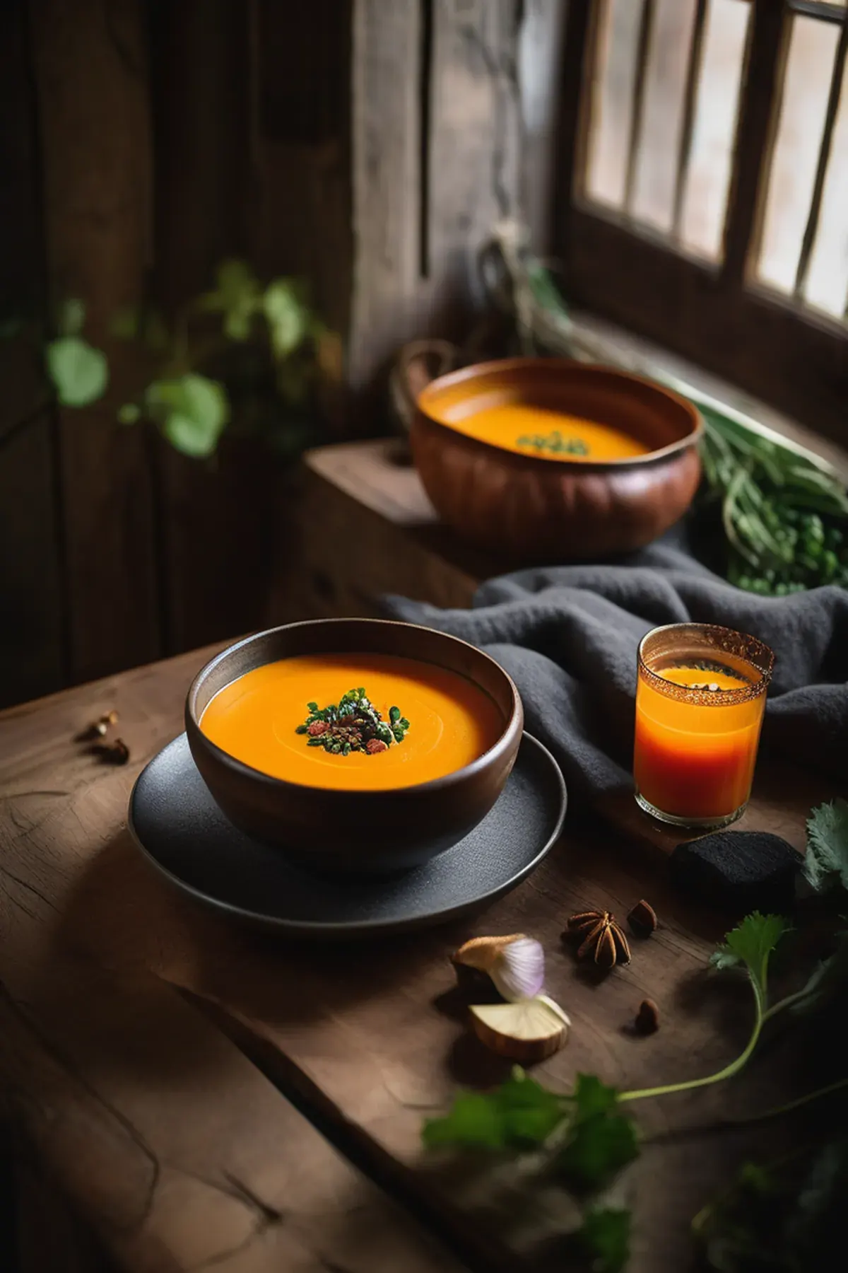 A silky, warming pumpkin soup with roasted garlic and sage, finished with a drizzle of cream and toasted seeds for satisfying texture.