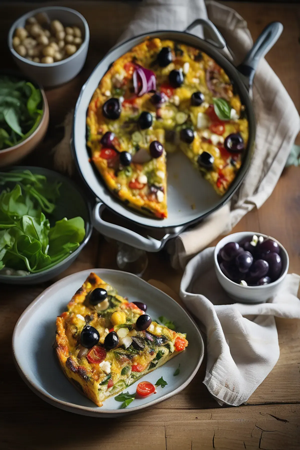 Quick veg frittata with feta, olives & salad