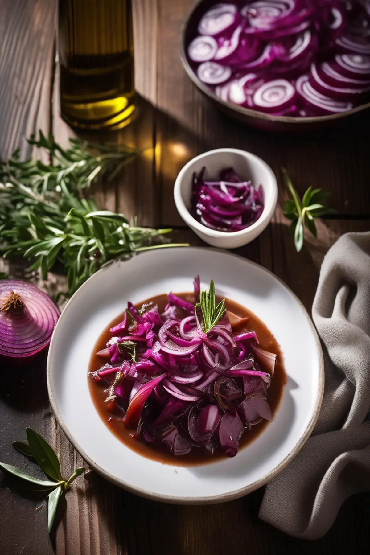 Heat the olive oil and butter in a wide saucepan over a medium heat and add the red onions, thyme sprigs, bay leaves, caster sugar and a pinch of salt. Stir to coat. Pour in just enough boiling water to cover, and bring to the boil. Simmer for 10-15 mins until the water has completely evaporated.