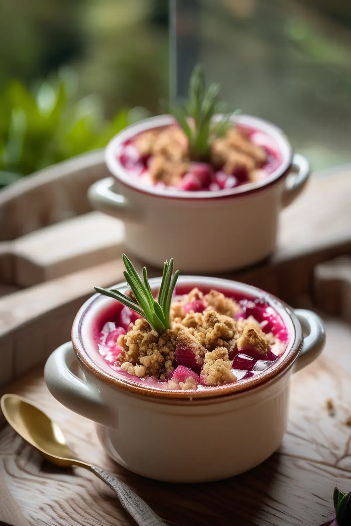Making these rhubarb and custard pots has become my go to dessert when I want something that feels fancy but doesn't require hours in the kitchen. The silky custard pairs beautifully with sharp, tangy forced rhubarb, which is wonderfully high in vitamin K for bone health. I love that you can prepare everything ahead and simply pop them in the oven about an hour before serving, making it perfect for entertaining without stress. The rosemary crumble adds an unexpected herbal note that keeps people guessing, and honestly, it's such a simple topping to throw together. These little pots always impress but never overwhelm me with fussy techniques.