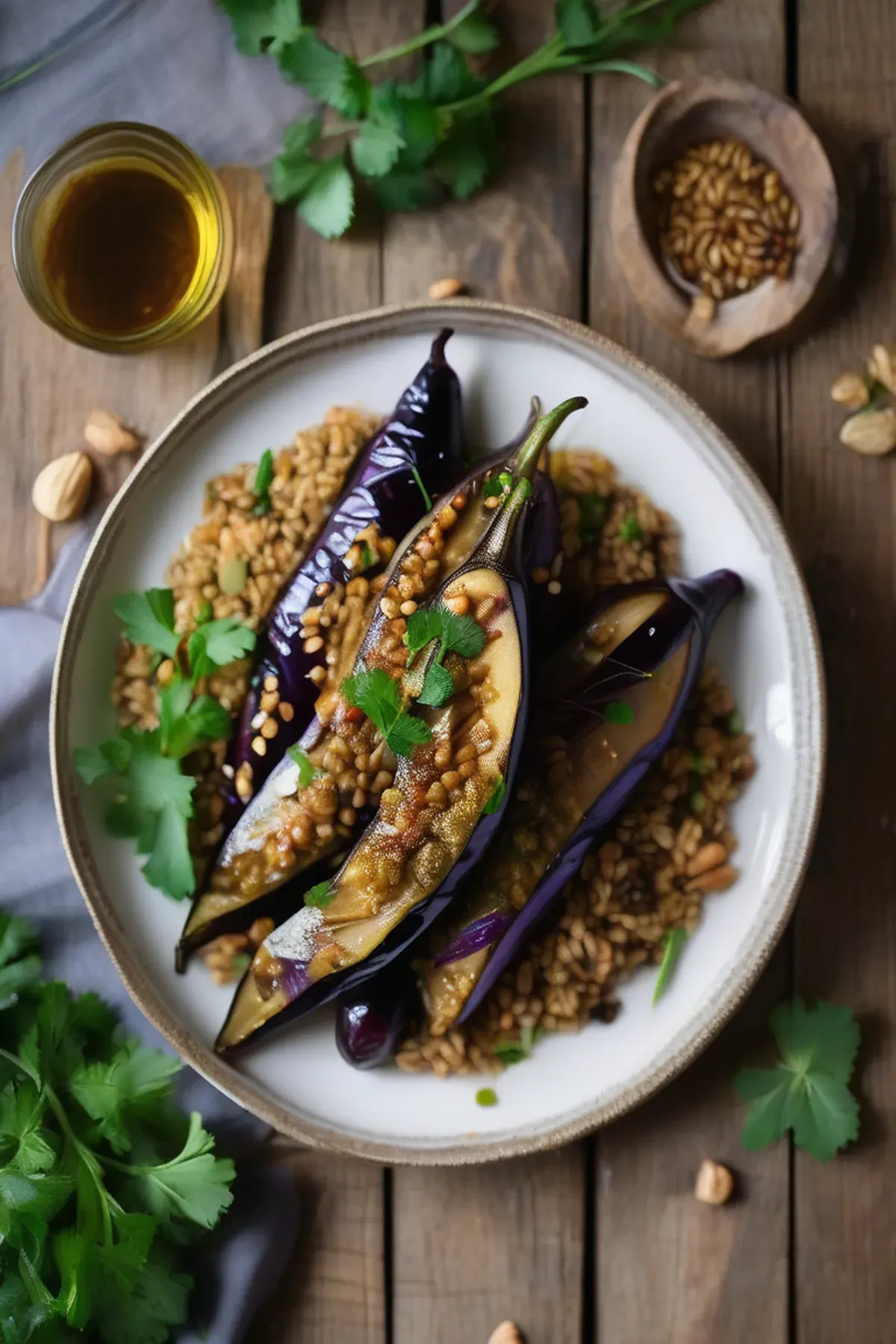 Roasted aubergine with freekeh & amba sauce