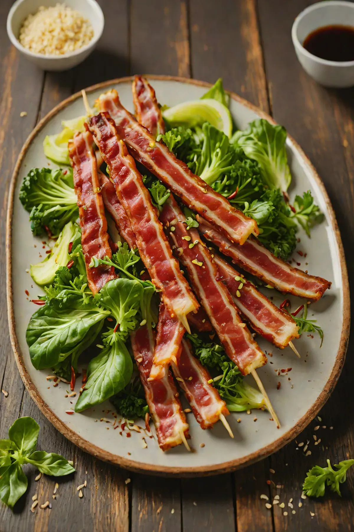 While bacon cooks, whisk together sesame oil, soy sauce, rice vinegar, minced ginger, and red pepper flakes in a small bowl.