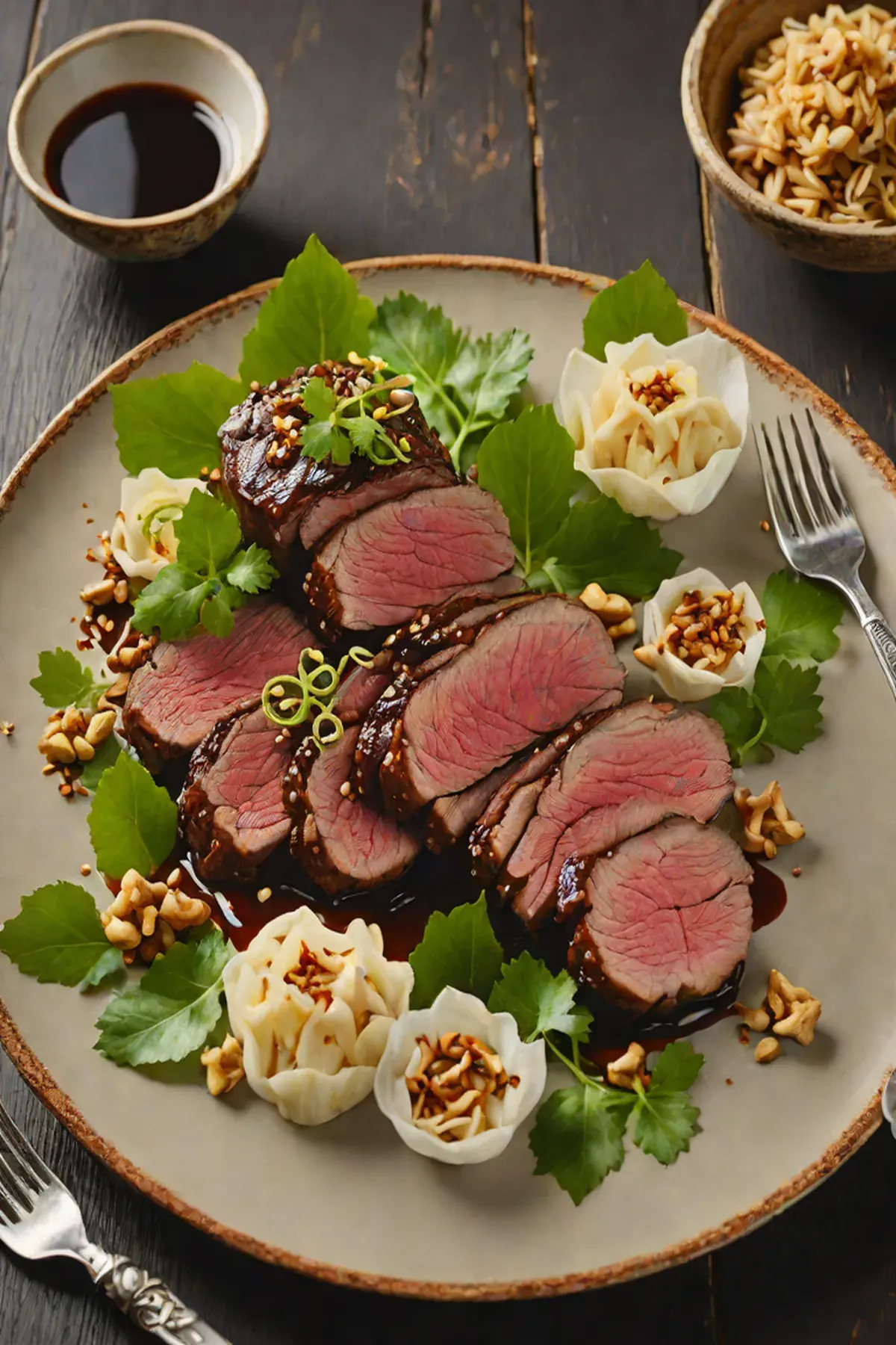 Transfer the roasted beef and sauce to a serving platter, arrange the roasted lotus root around it, garnish with green scallion parts and sesame seeds, and serve immediately.