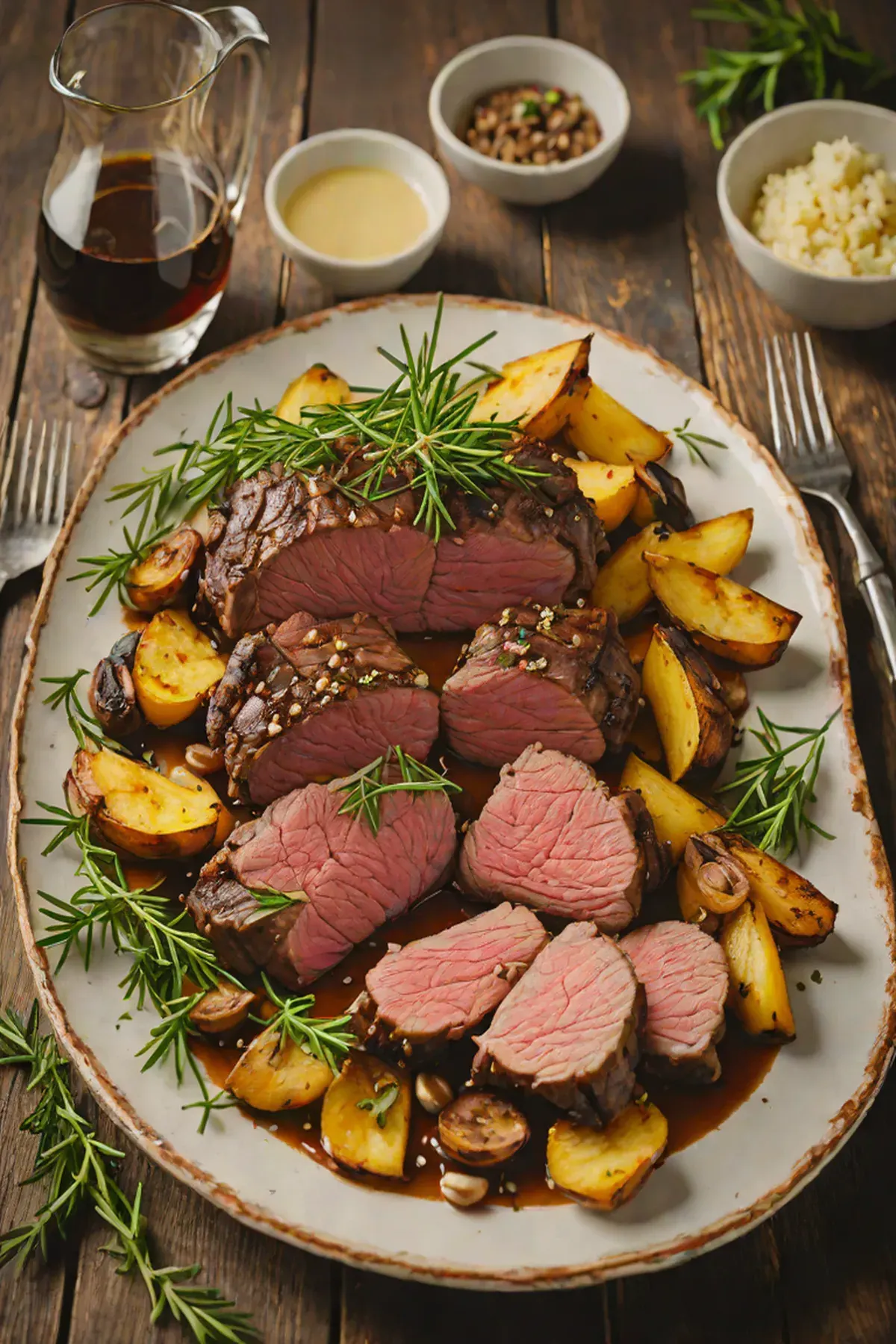 In a small bowl, combine minced garlic, rosemary, thyme, paprika, black pepper, and sea salt. Massage this herb mixture all over the beef roast, working it into any crevices.