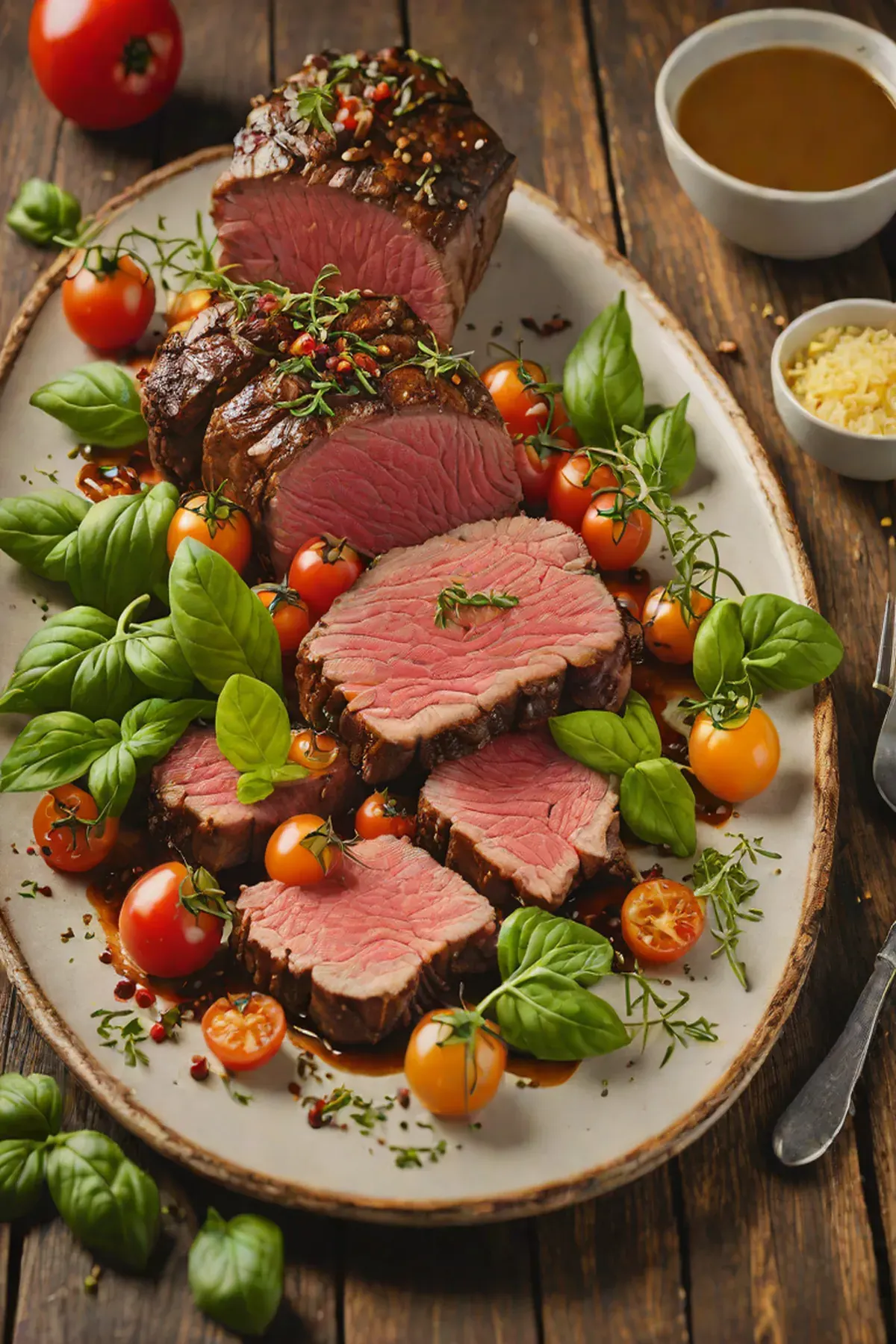 Slice the rested beef into quarter-inch thick slices and arrange on serving plates. Spoon the warm tomato sauce with vegetables around the beef and serve immediately.