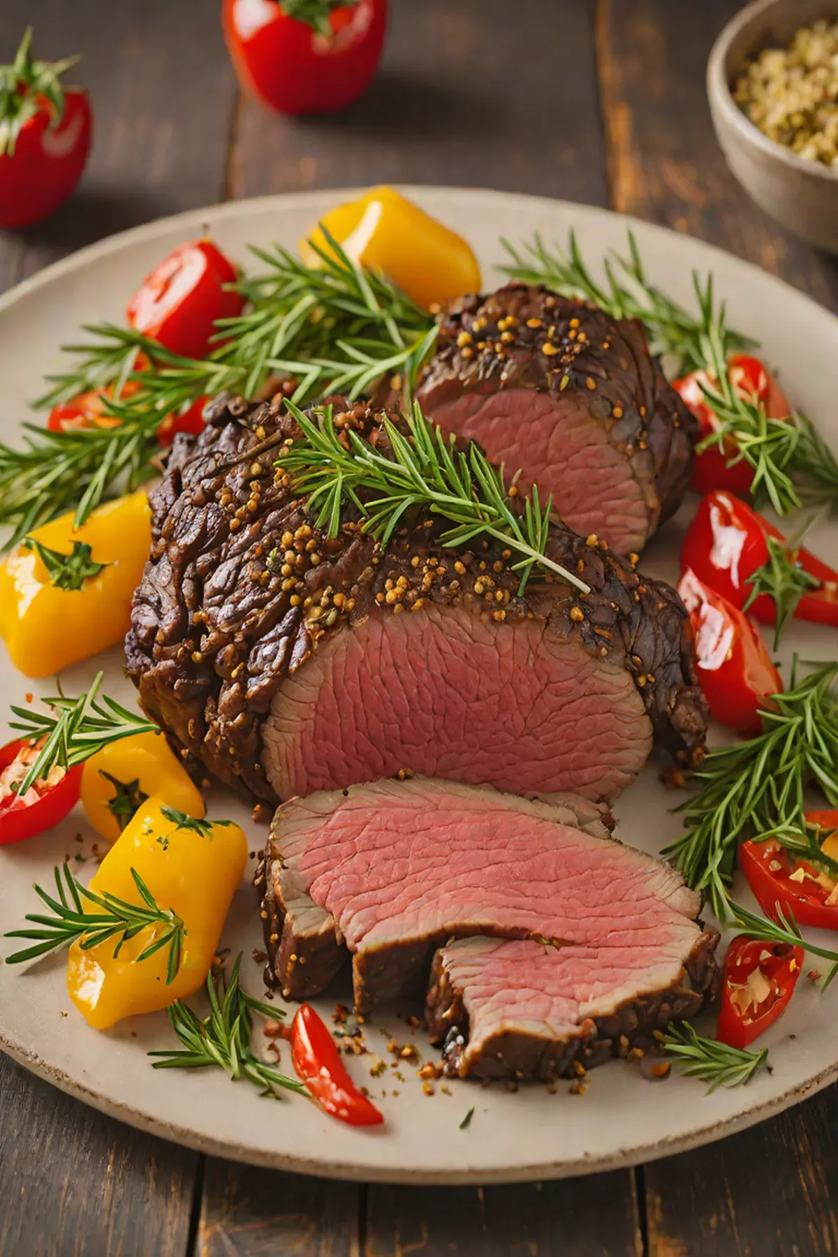 Remove from oven and let the roast rest for 5 minutes before slicing. Serve with the roasted peppers and pan sauce spooned over top.