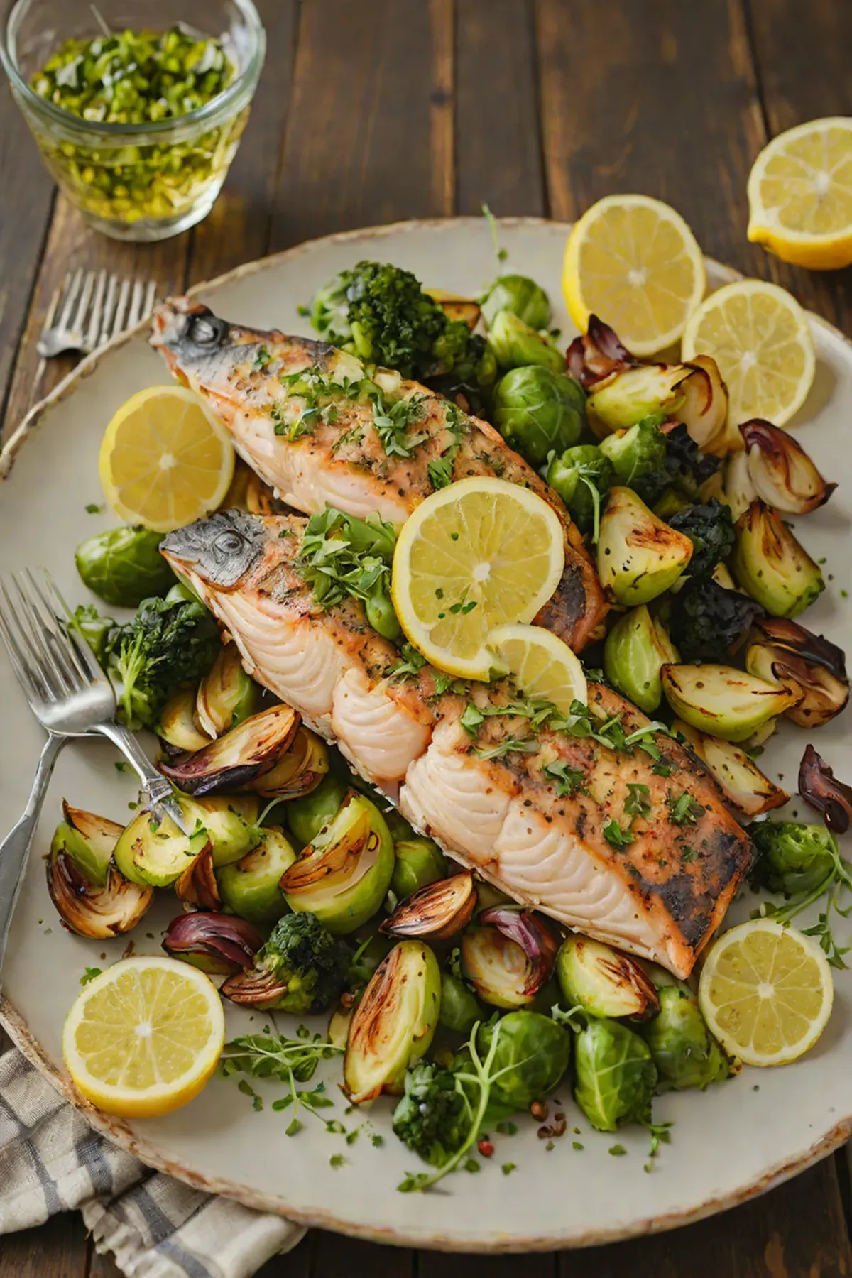 Remove Brussels sprouts from oven and add to the skillet with the lemon-herb butter. Toss gently to coat, then return catfish to the pan.