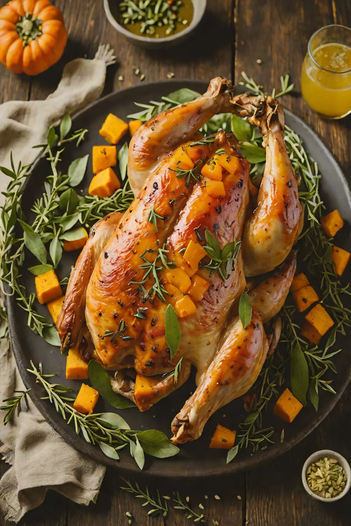 Carve the chicken and serve alongside the caramelized pumpkin, pan sauce, and fresh herbs as garnish.