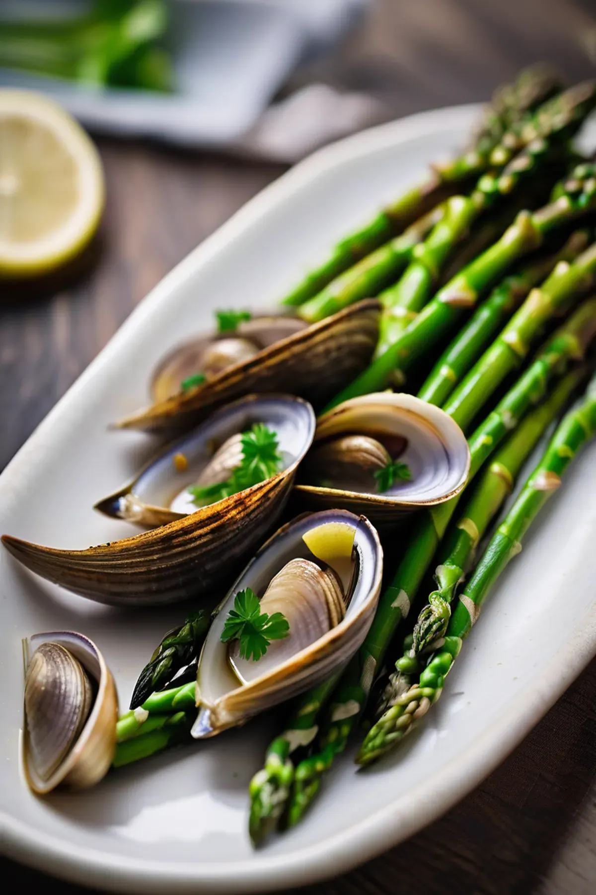 Succulent littleneck clams and tender asparagus spears roasted together with garlic, white wine, and fresh herbs, finished with a drizzle of vibrant herb butter and crispy breadcrumbs.