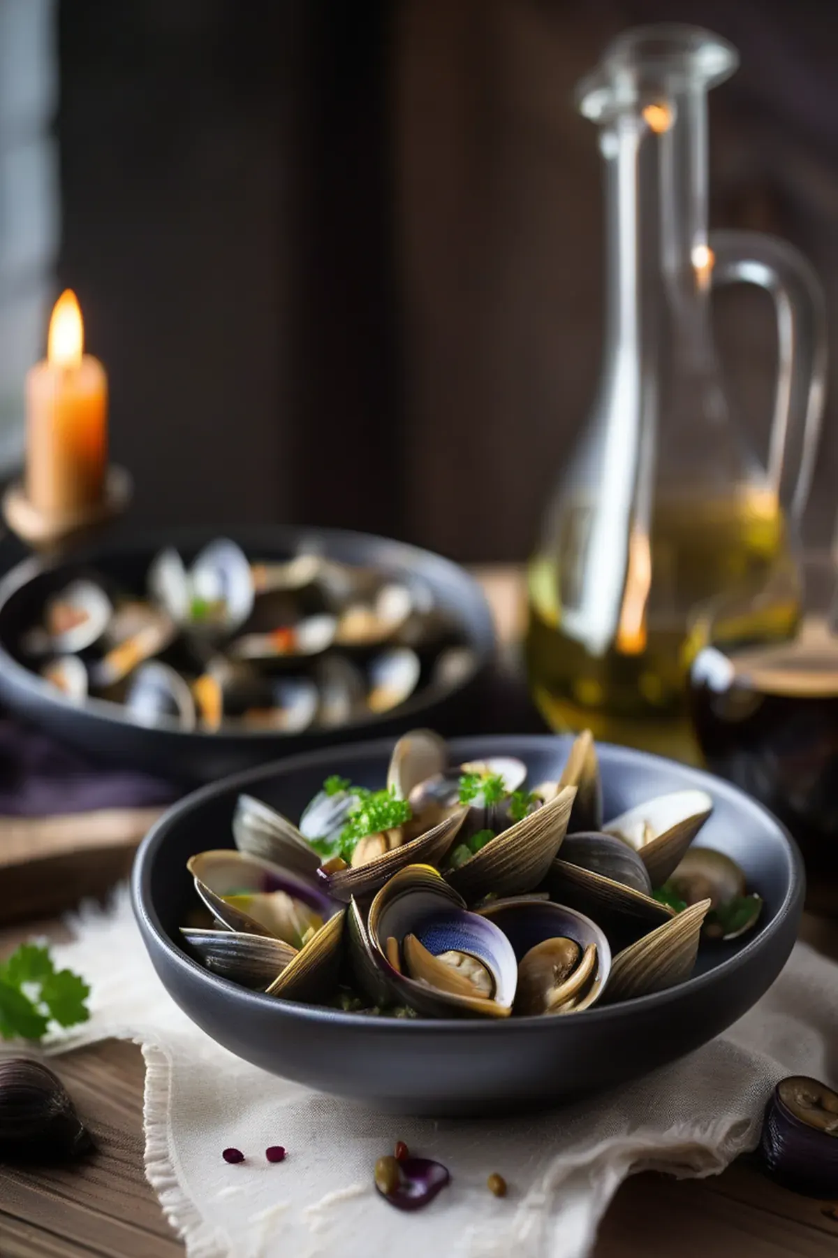 Tender littleneck clams and silky roasted aubergine come together in this Mediterranean-inspired dish, finished with garlic, white wine, and fresh herbs for a sophisticated seafood experience.