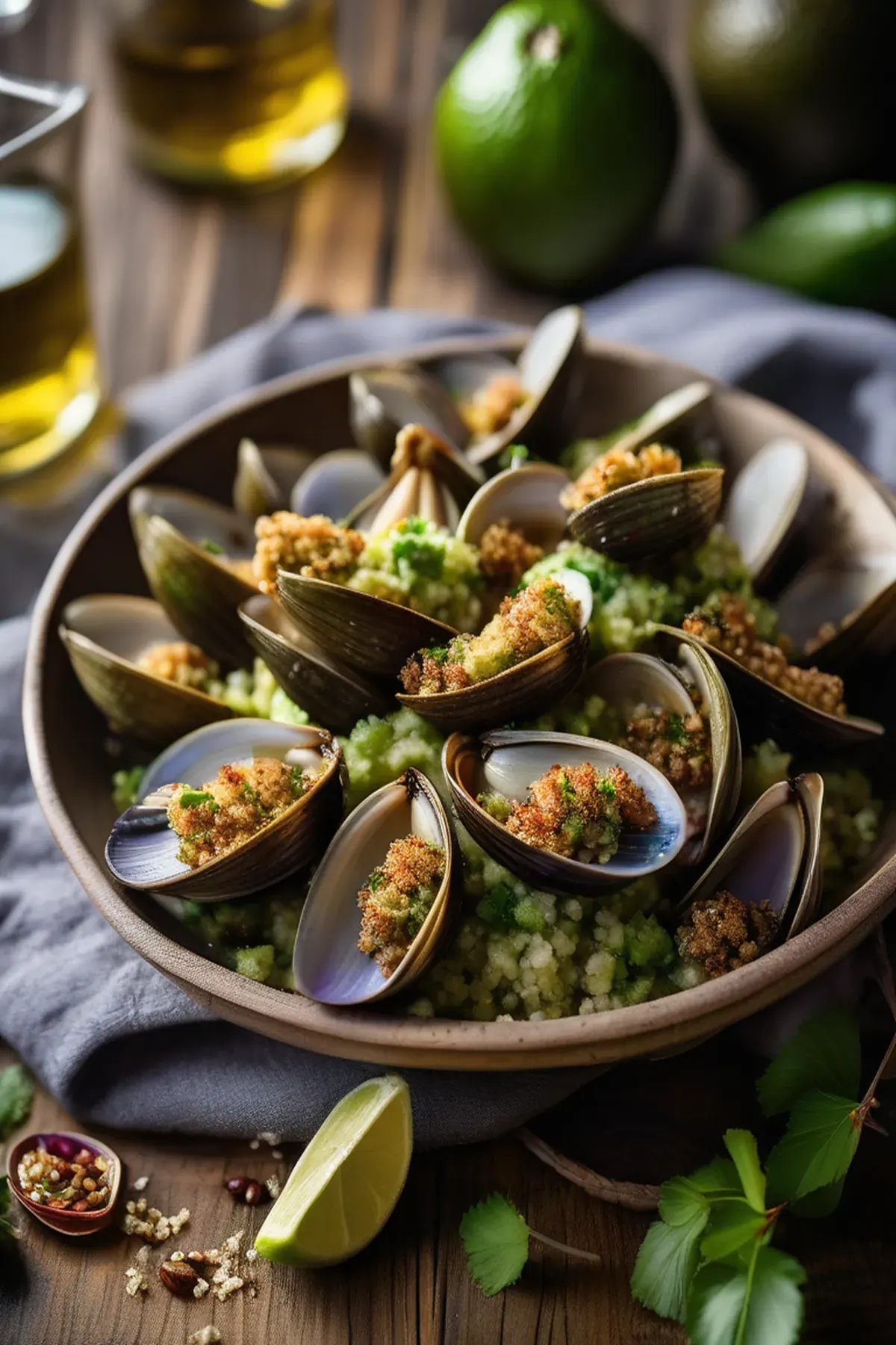 Succulent littleneck clams roasted until tender and topped with creamy avocado, crispy garlic breadcrumbs, and a bright citrus drizzle for an elegant yet simple seafood appetizer.