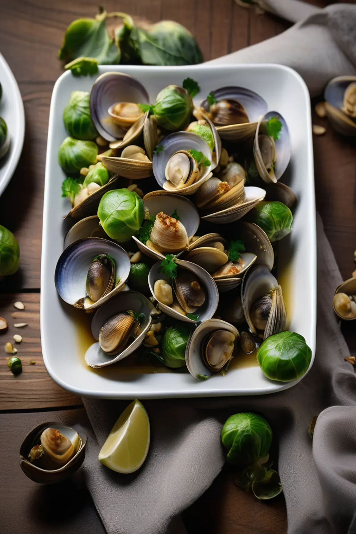 Succulent clams nestled among crispy roasted Brussels sprouts, finished with a savory garlic butter sauce and fresh herbs. A sophisticated yet simple coastal-inspired dish that's elegant enough for entertaining.