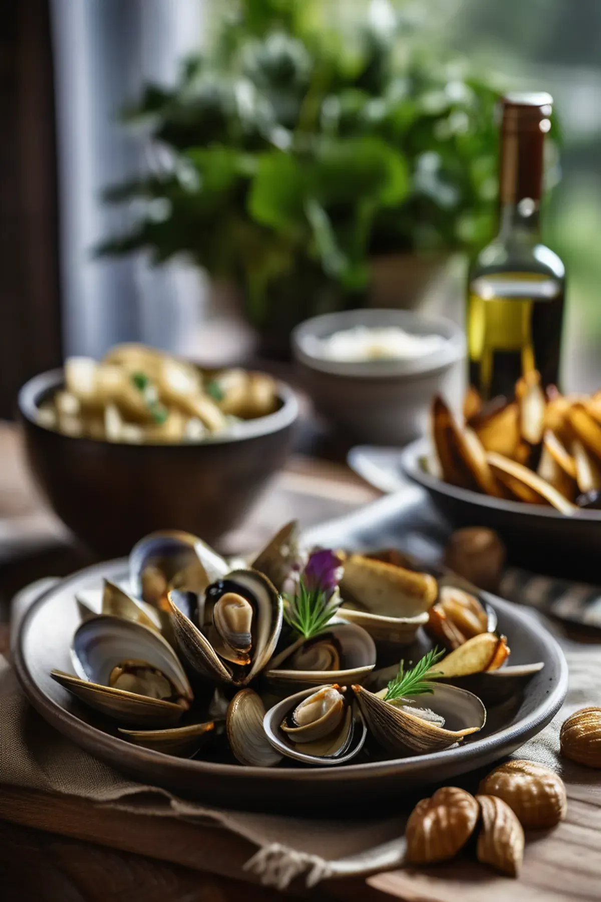 Tender littleneck clams roasted until they open, served alongside golden potato wedges seasoned with fresh herbs and a drizzle of aromatic garlic butter infused with white wine.