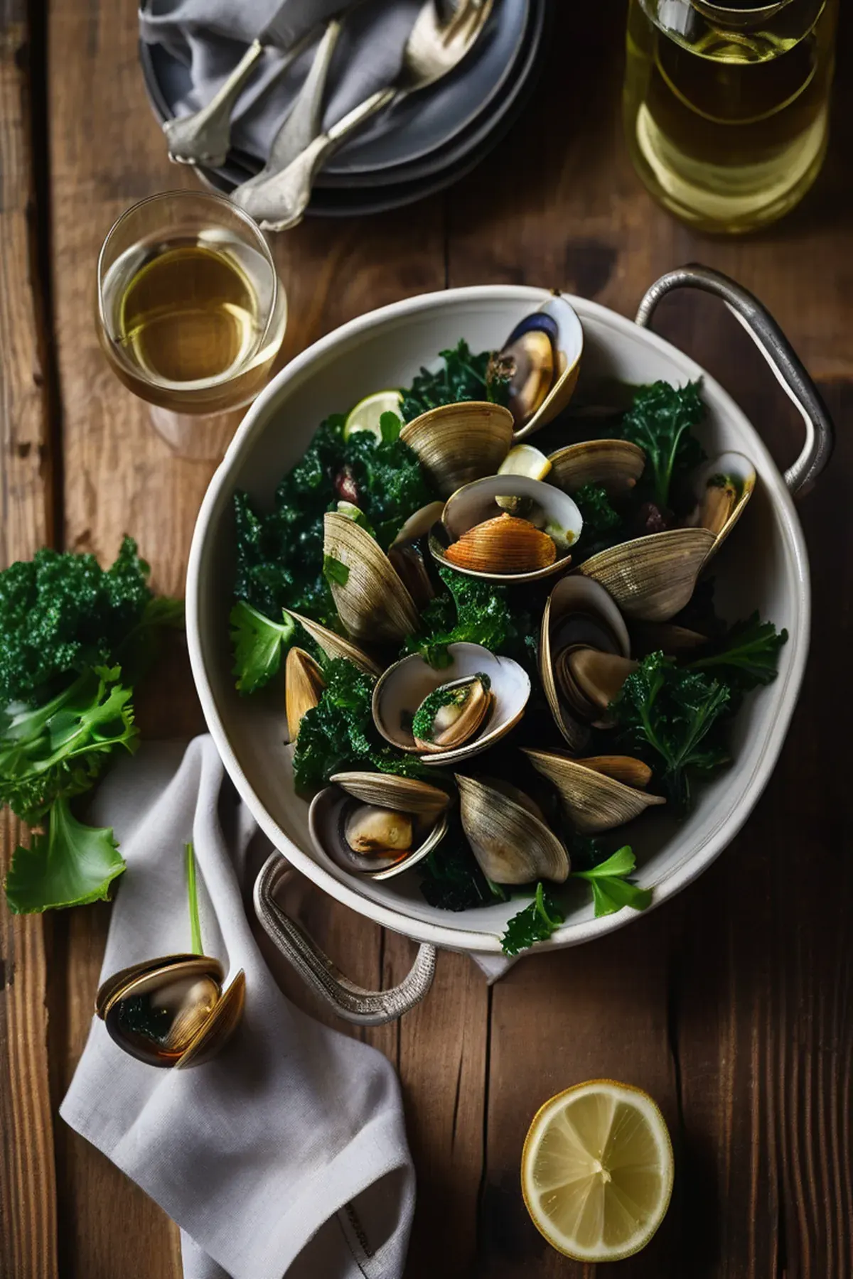 Create a well in the center of the kale bed and arrange the cleaned clams around it. Drizzle the clams with the remaining 2 tablespoons of olive oil.