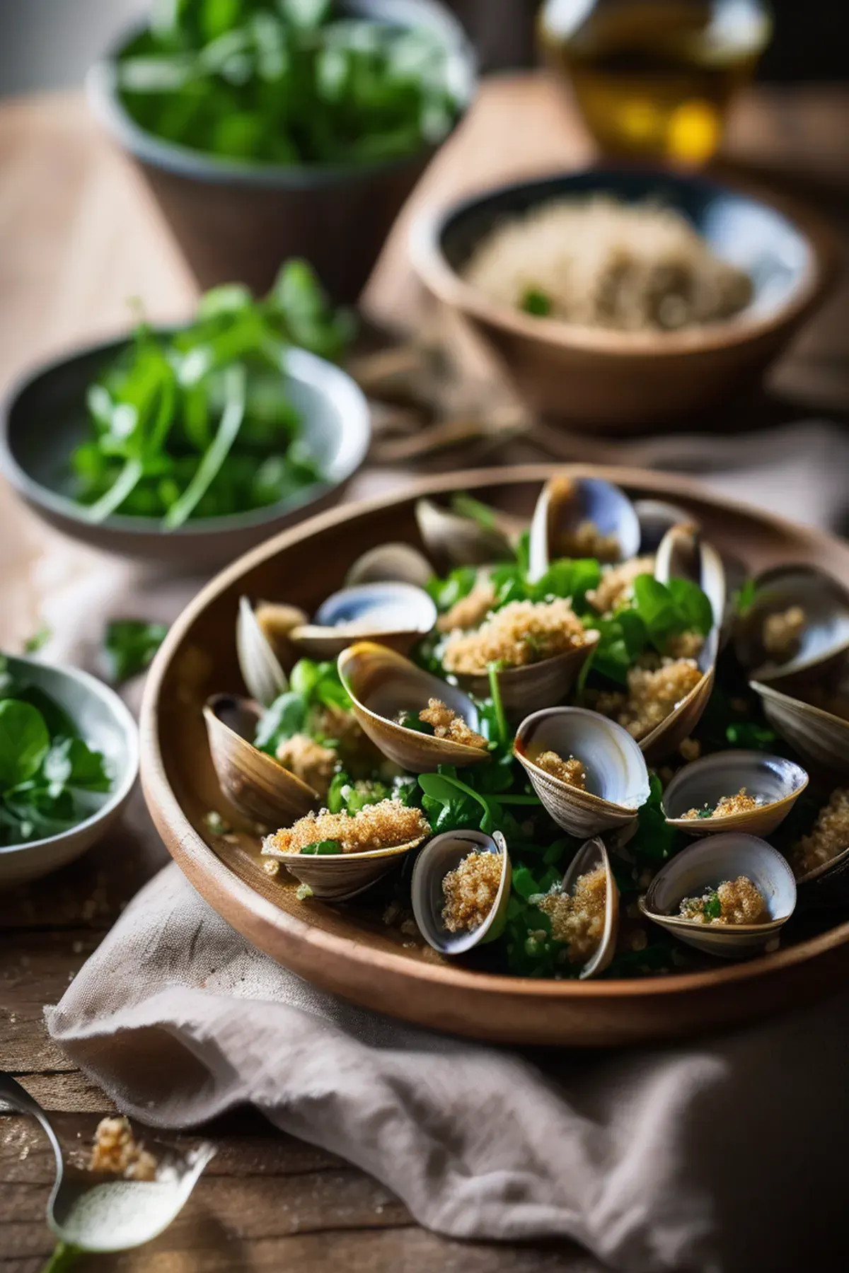 Drizzle any remaining dressing around the clams and finish with a generous sprinkle of the crispy garlic breadcrumbs over the top.