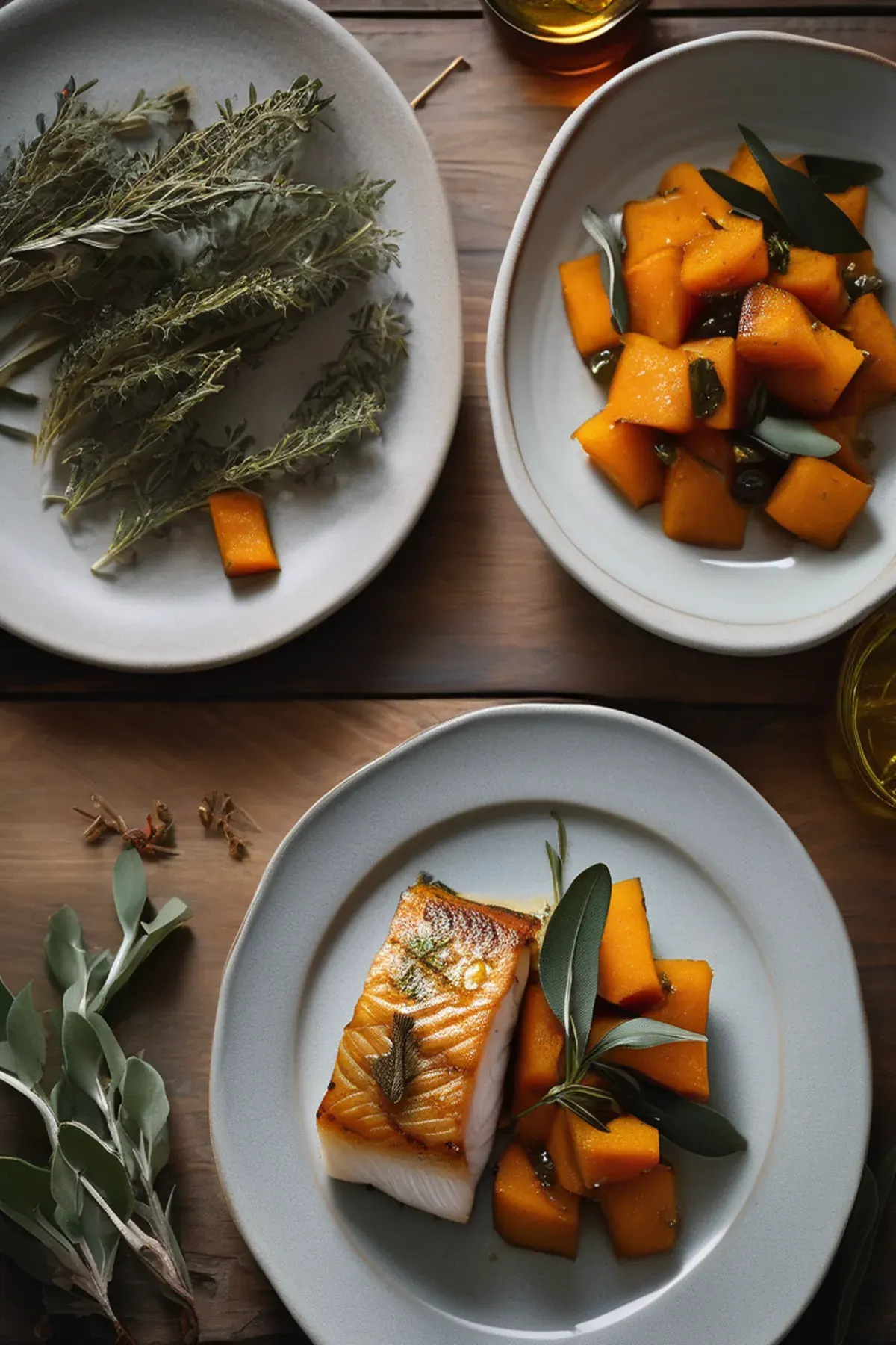 Delicate flaky cod fillet paired with caramelized roasted pumpkin cubes and a fragrant sage brown butter sauce, creating an elegant autumn-inspired dish.
