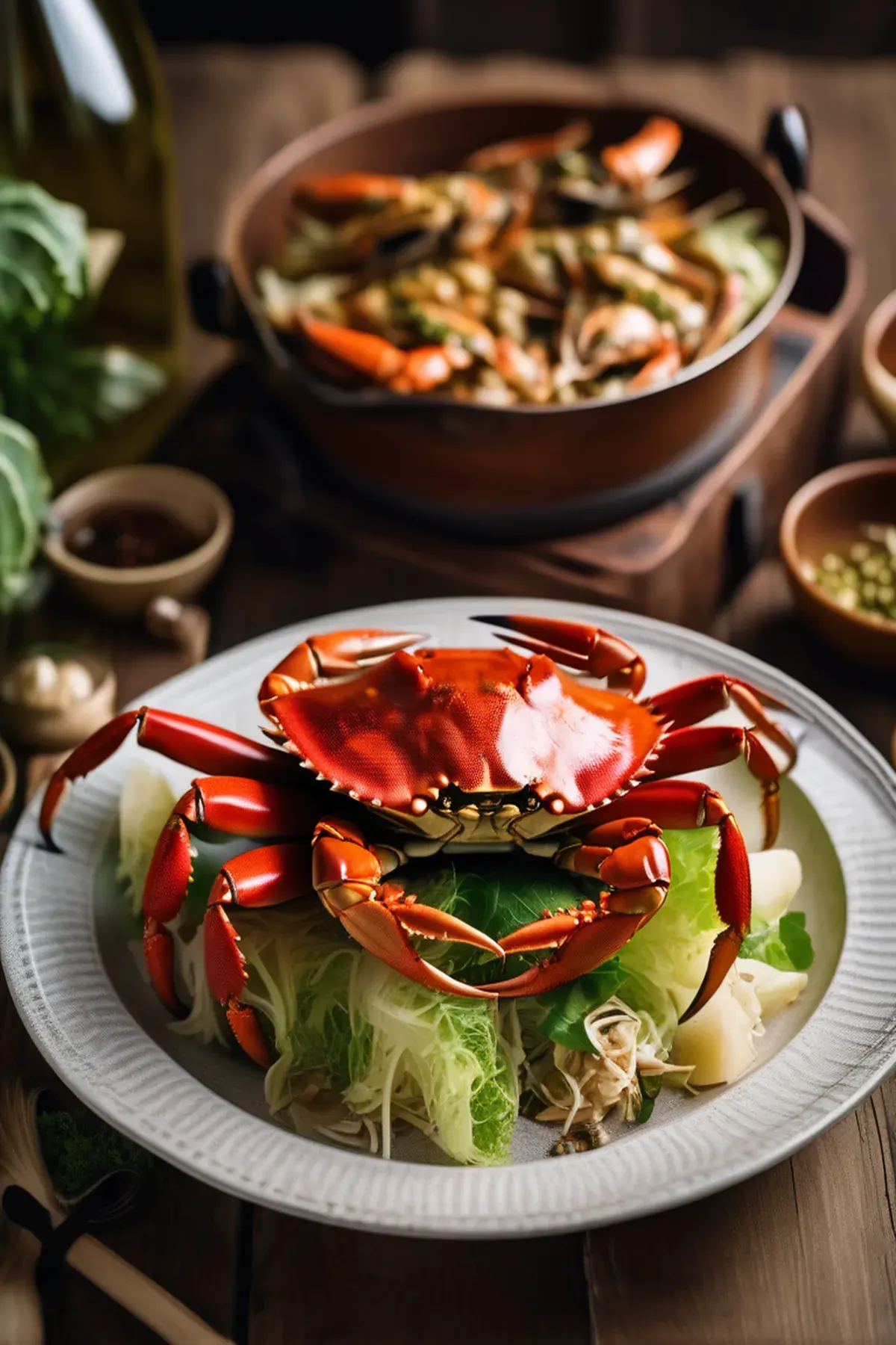 Sweet succulent crab meat nestled in a bed of caramelized cabbage with garlic and herbs, creating a elegant yet simple dish bursting with coastal flavors.