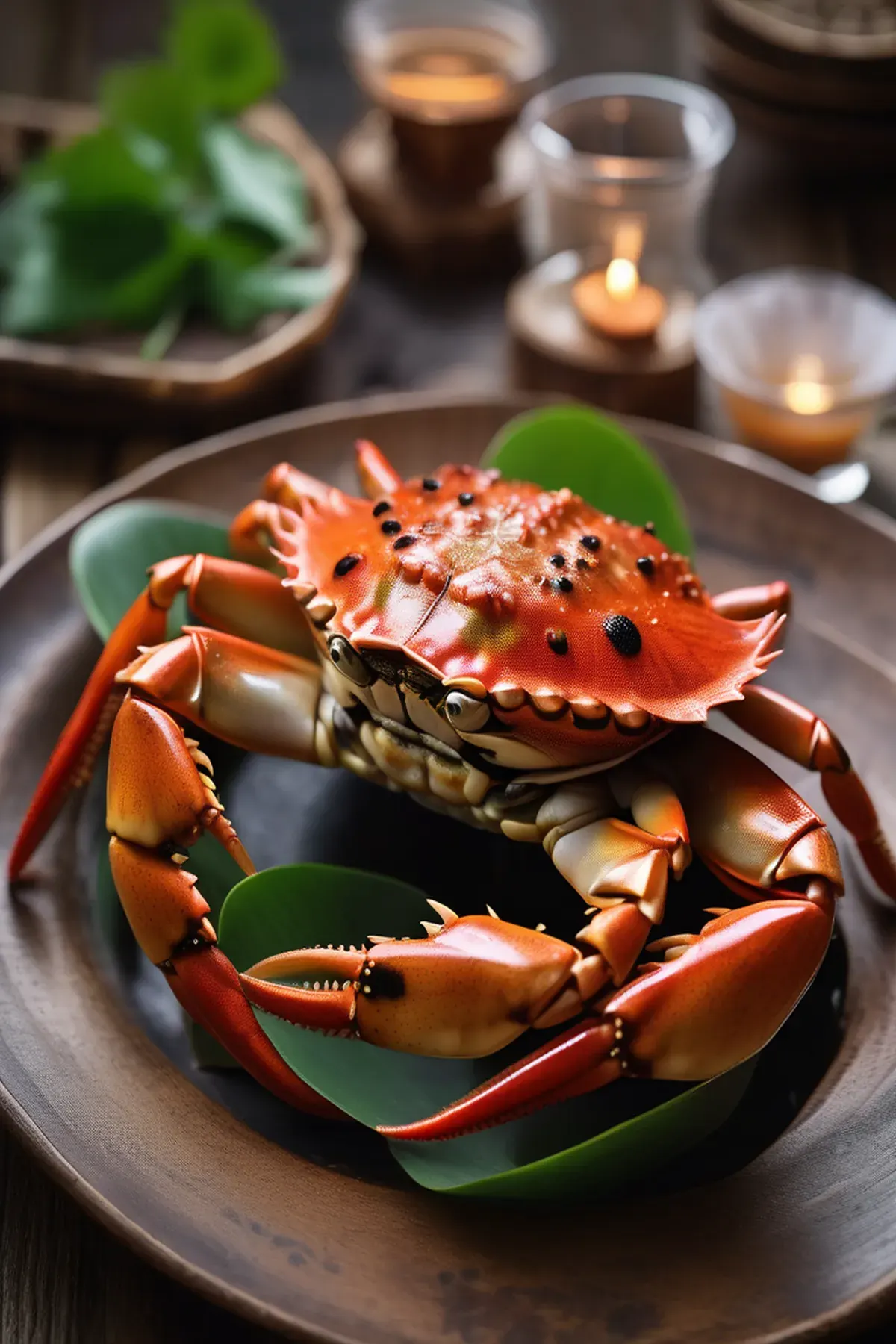 A delicate Asian-inspired dish featuring succulent roasted crab paired with crispy-edged lotus root slices, finished with a savory garlic-ginger glaze and fresh herbs for an elegant seafood experience.