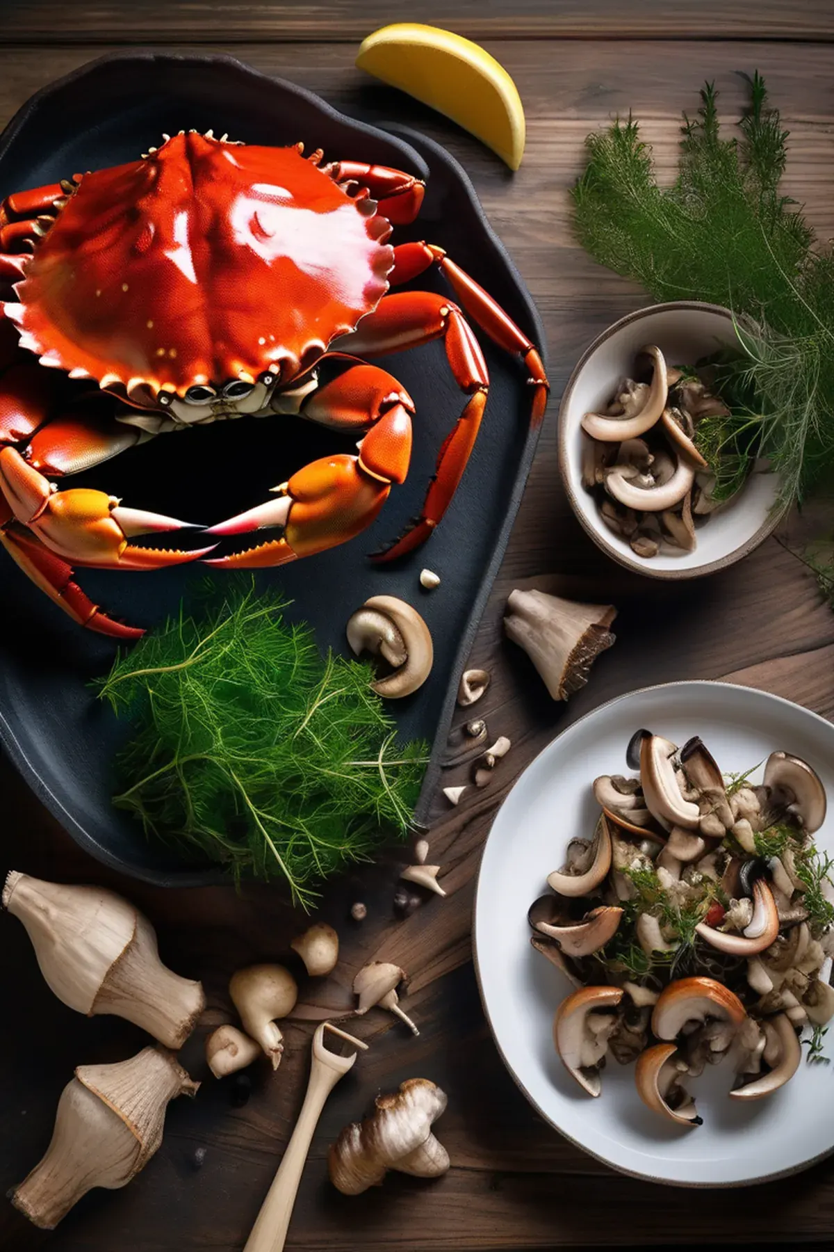 Succulent crab clusters roasted alongside earthy mushrooms in a garlic butter sauce, creating a elegant yet simple seafood dish bursting with umami flavors.