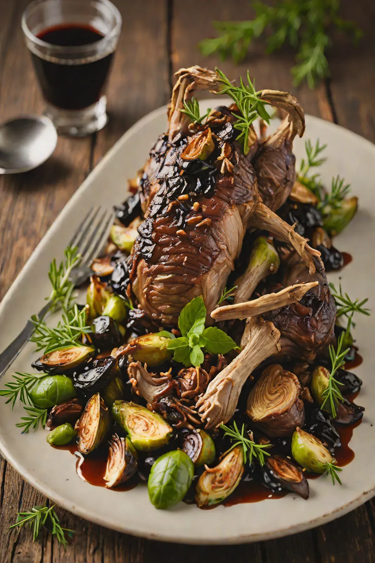 Roasted Goat with Caramelized Brussels Sprouts and Balsamic Glaze