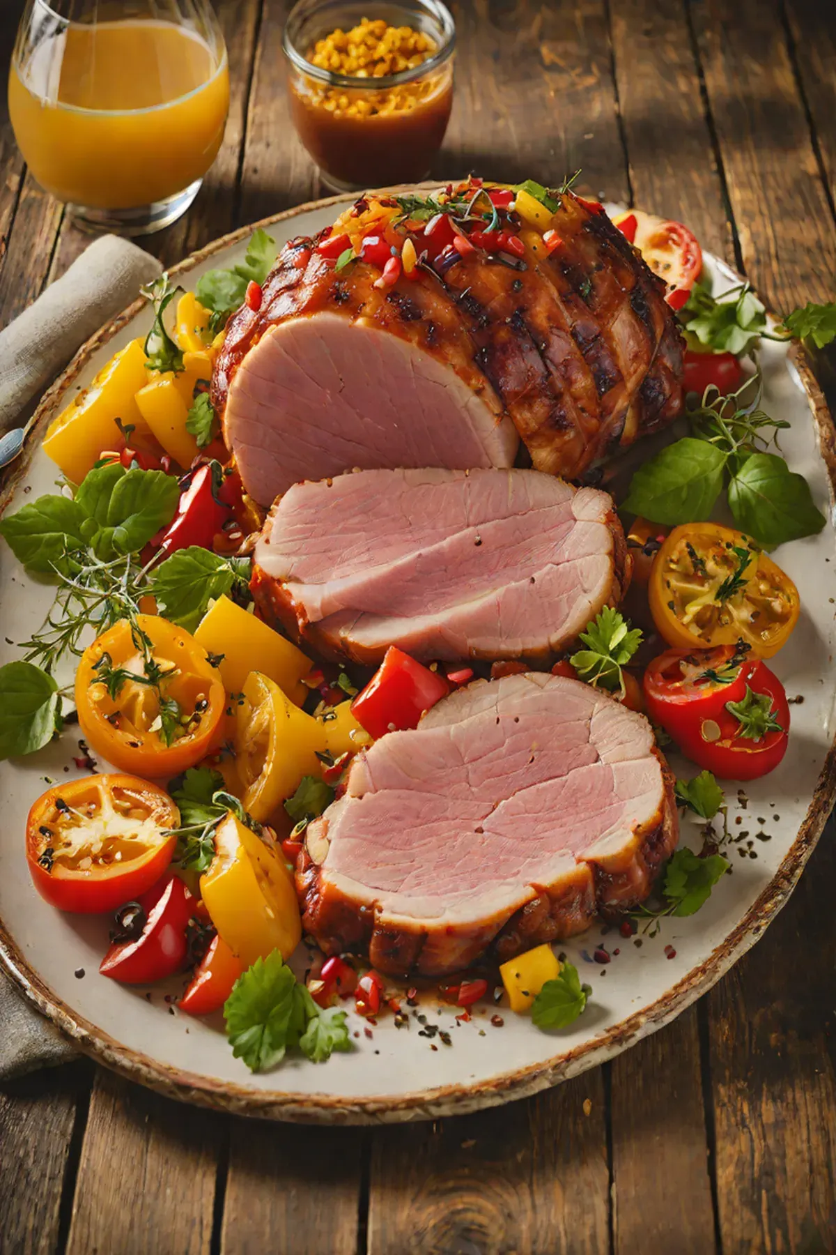 Stir the roasted vegetables and brush any remaining glaze on the ham steaks, then return to the oven for 12-15 minutes until peppers are tender with charred edges.