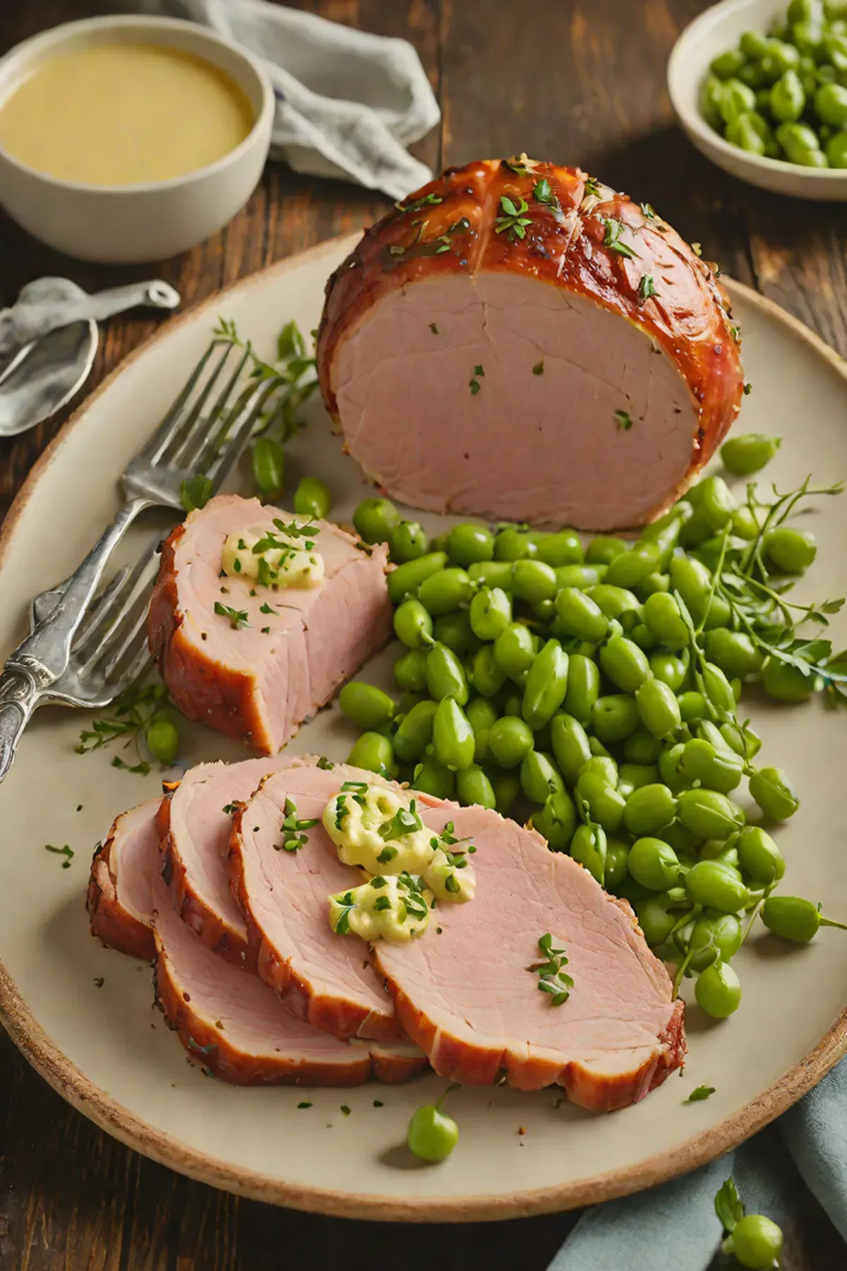 Remove the ham from the oven and let it rest for 5 minutes before slicing. Arrange slices on a platter and serve with the herbed peas alongside.