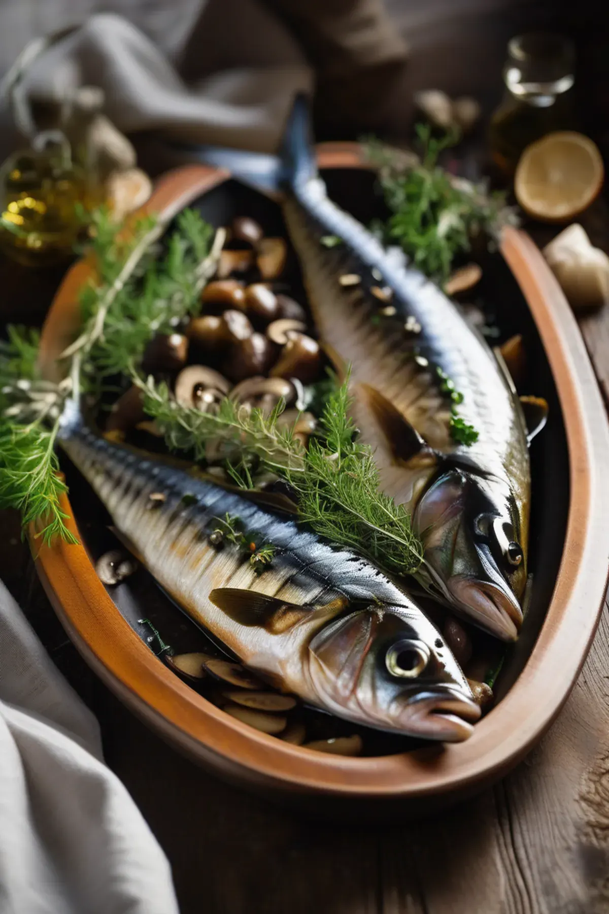 Pan-seared mackerel fillets topped with a rich medley of roasted mushrooms, garlic, and fresh thyme, finished with a squeeze of lemon and drizzle of olive oil.