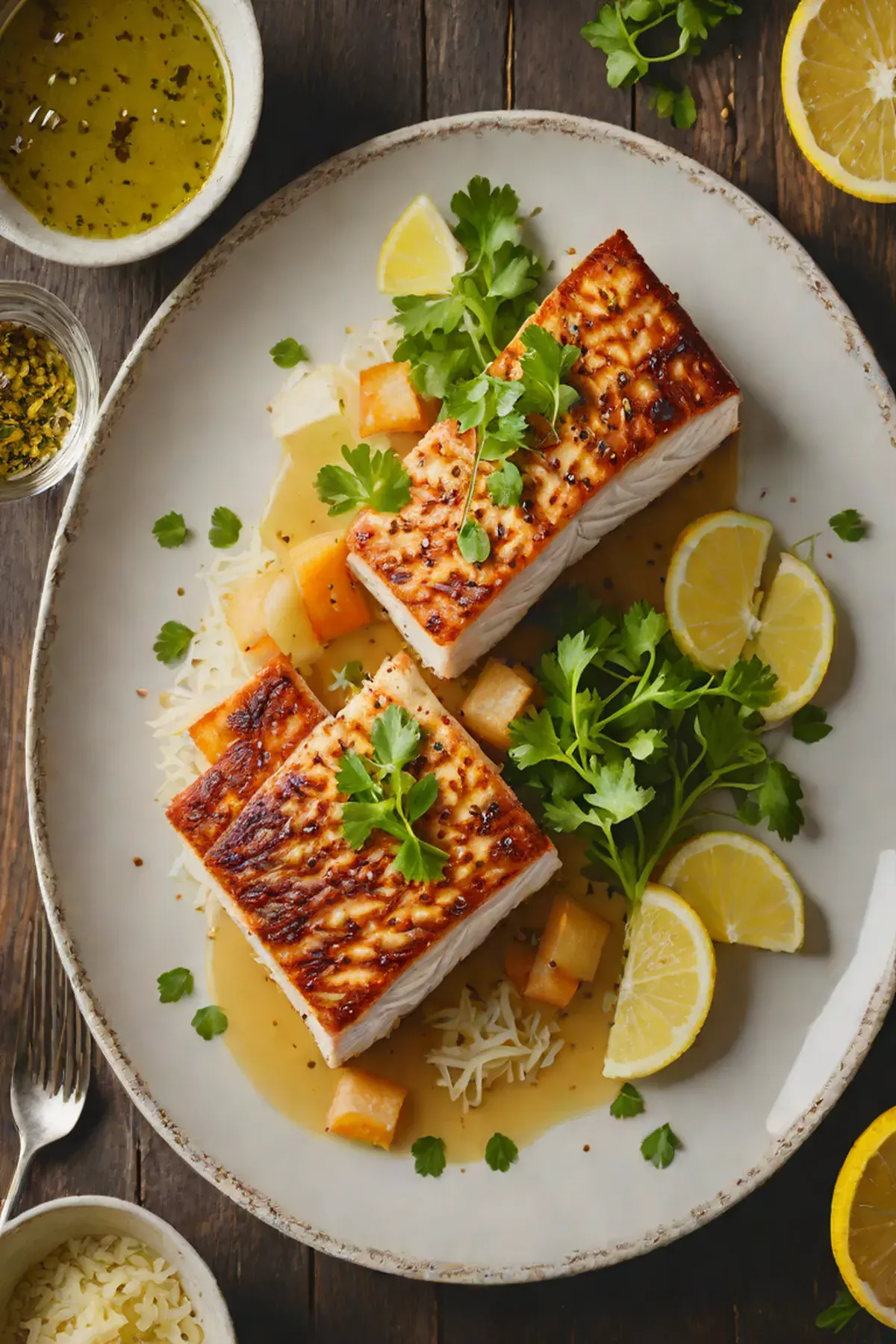 Drizzle the warm herb-lemon butter sauce over the fish and daikon. Serve immediately while hot.