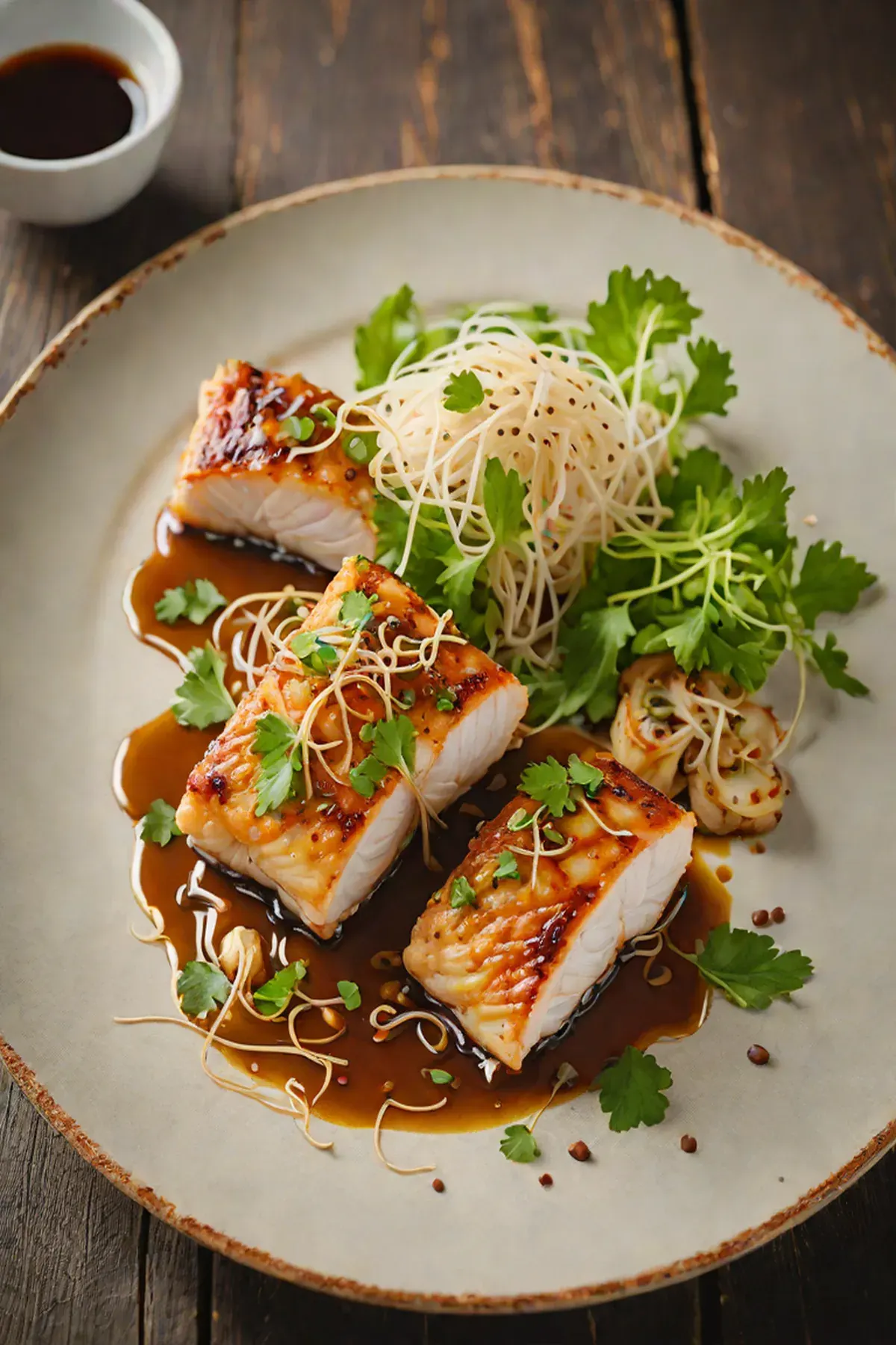 Roasted Monkfish with Bean Sprout and Soy-Ginger Glaze
