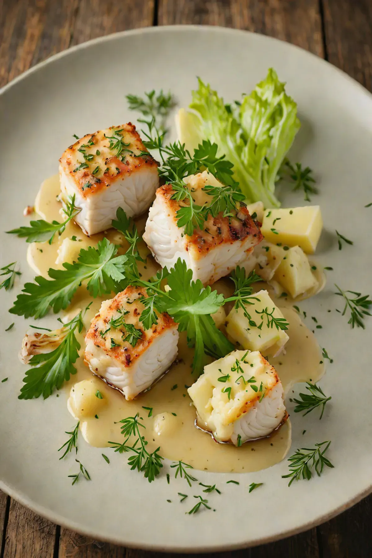Spoon the celery root purée onto each plate, place a monkfish fillet on top, and garnish with crispy celery leaves and a light sprinkle of fleur de sel.