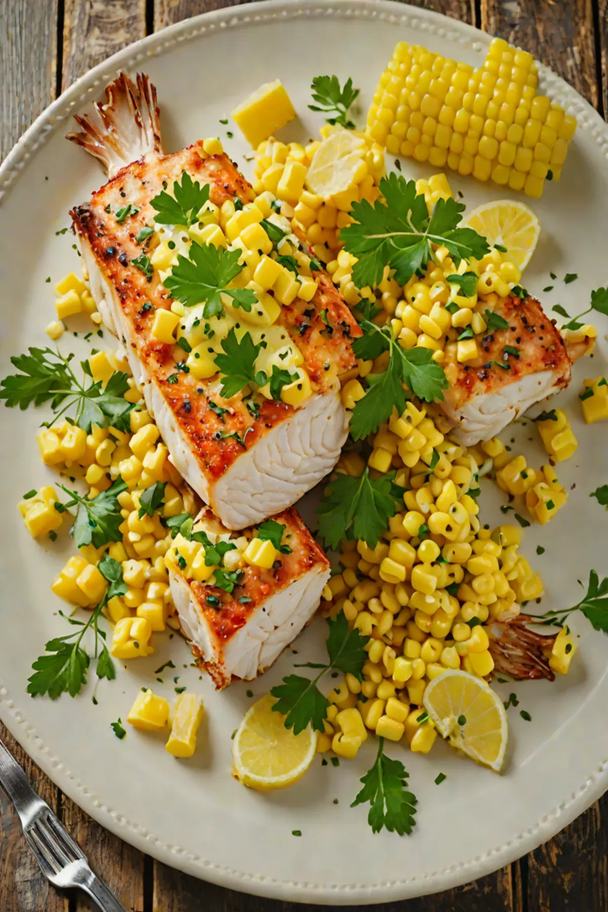 Remove from the oven and let rest for 2 minutes before serving. Spoon the pan juices and corn over the fish.