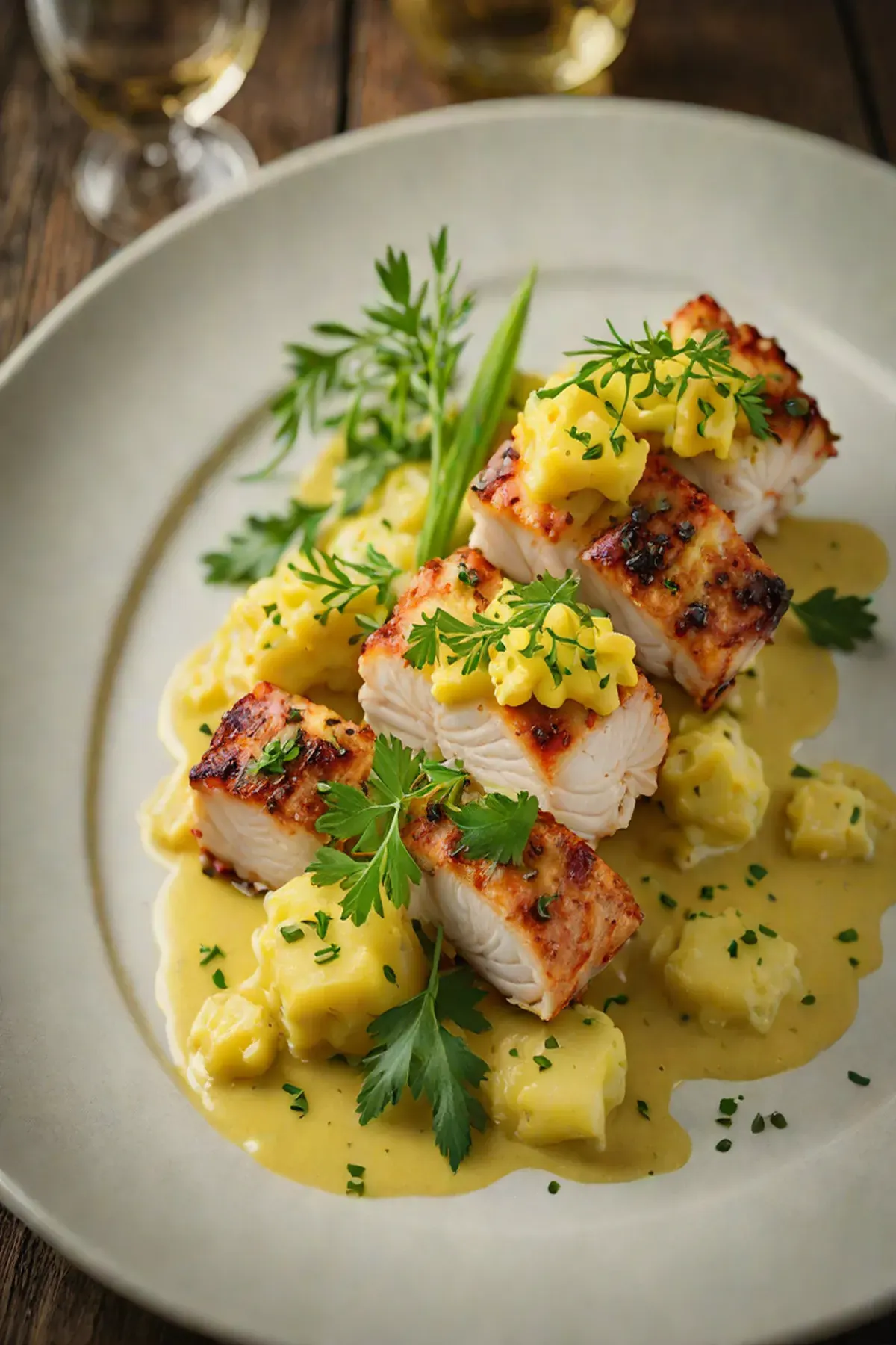 Spoon the saffron butter sauce over the roasted monkfish and leeks. Garnish with fresh herbs and serve immediately.