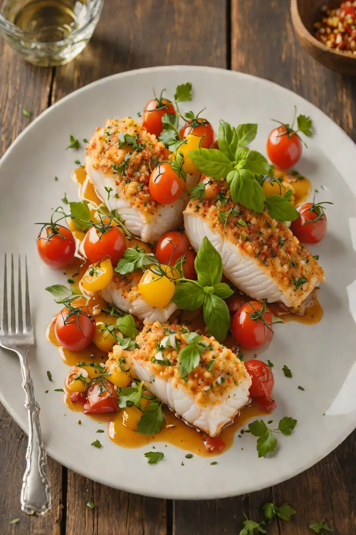 Remove the tomato pan from the oven and nestle the crusted monkfish fillets among the tomatoes. Pour the white wine and lemon juice around the fish and tomatoes.